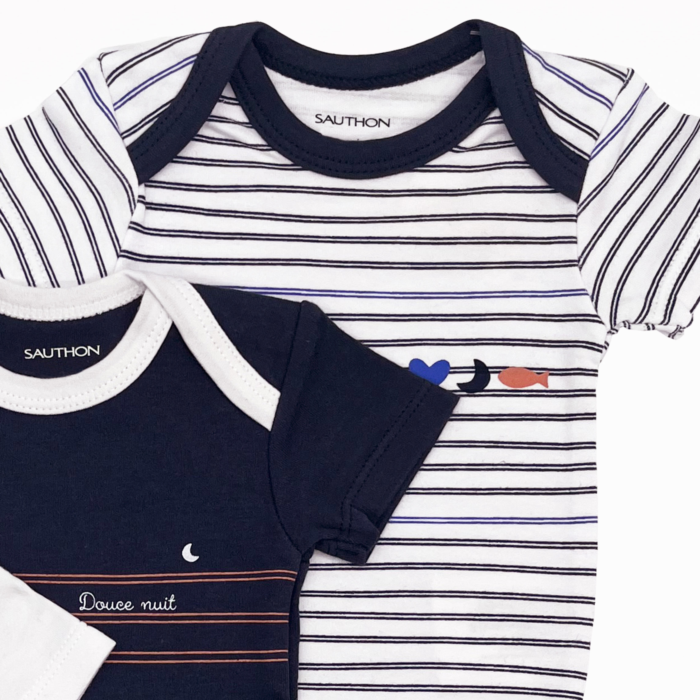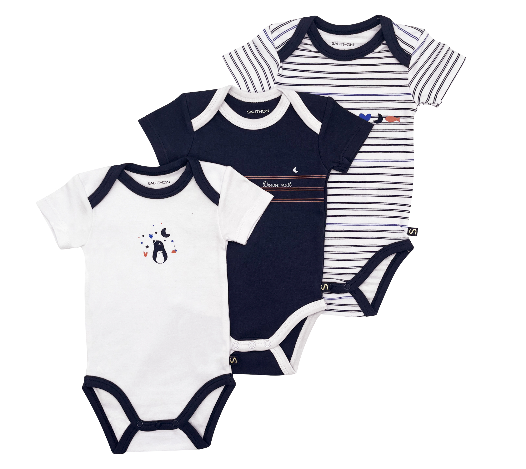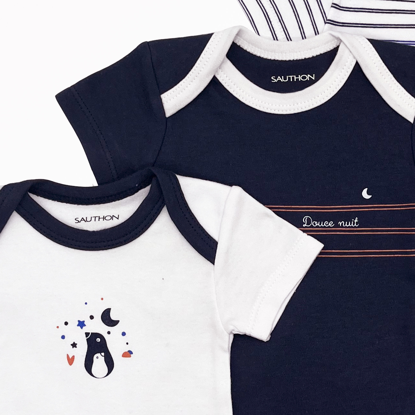 Les bodies Baby Sailor manches courtes sont vendus par lot de 3 pour permettre aux parents de changer bébé plusieurs fois dans la journée. Leur forme croisée est très pratique et recommandée jusqu'au trois mois de l'enfant afin de faciliter l'habillage et le déshabillage. Les jolis motifs marins de la collection Baby Sailor apportent chic et élégance aux bodies de bébé. Certifiée Oeko-tex Standard 100, ce label garantit l'absence de substance nocive ou irritante pour la peau.
