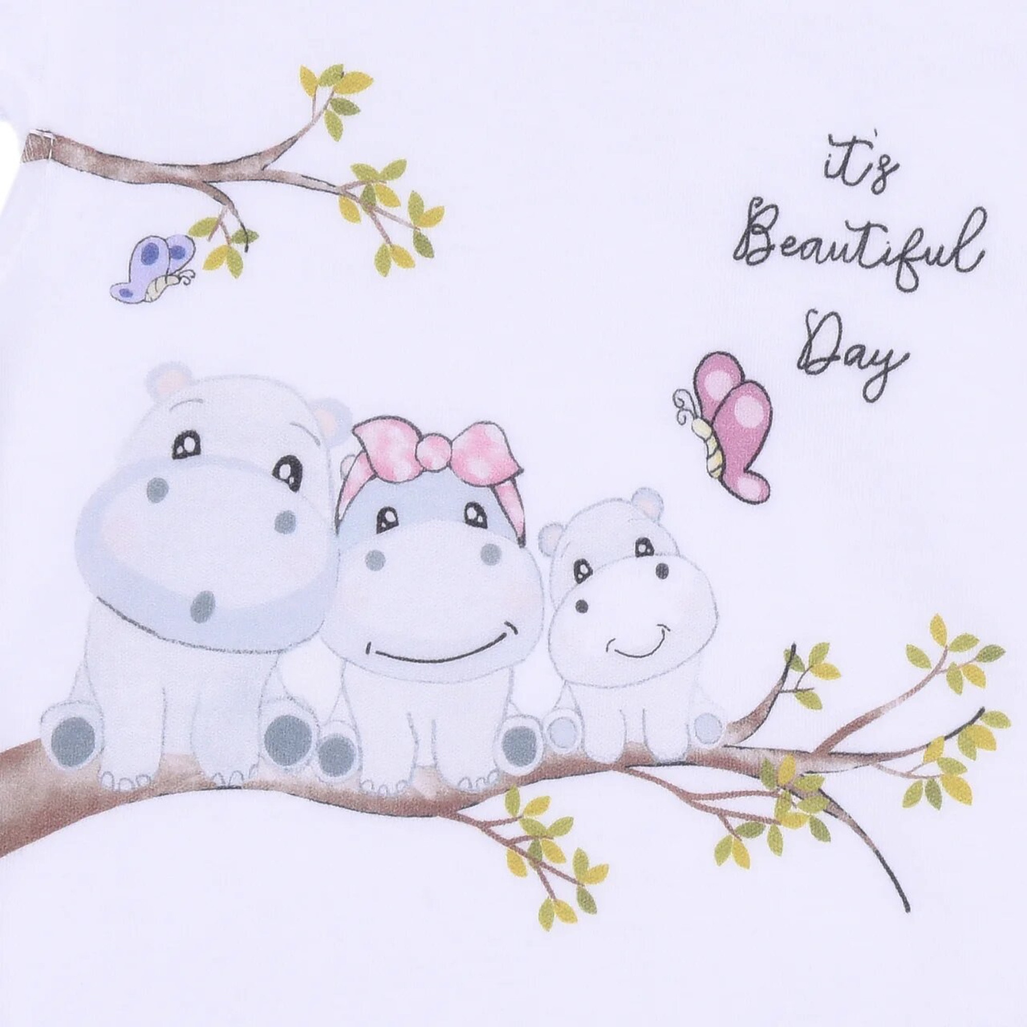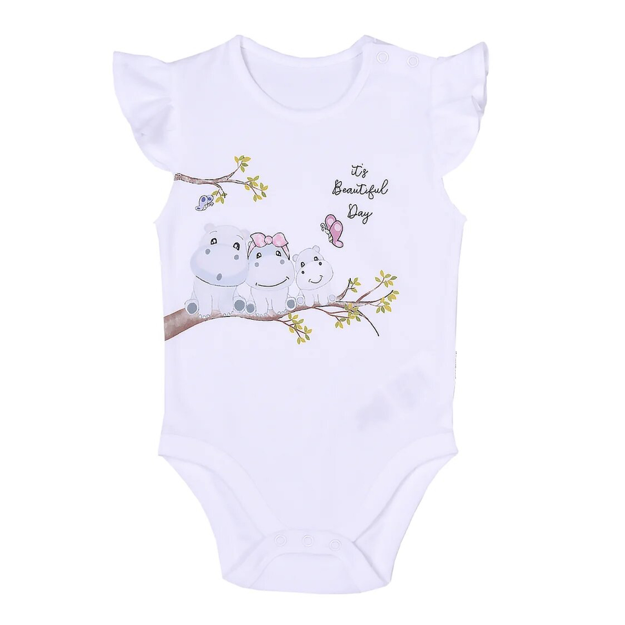 Le body façon "Marcel" est trop mignon avec sa finition volantée aux épaules. Une famille de gentils Hippos s'est installée sur une branche et envoie à Bébé un adorable message "It's beautiful day" qui se traduit par "c'est une belle journée".