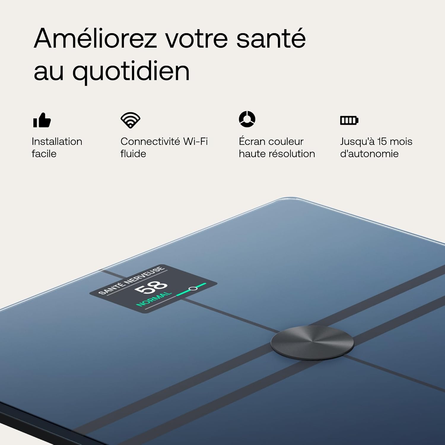 Body Comp offre une évaluation complète du corps : mesure de poids (à 50 g près), données de composition corporelle, évaluation cardiovasculaire (fréquence cardiaque debout, âge vasculaire) et score de santé nerveuse. Body Comp offre à ce jour l'aperçu des mesures corporelles le plus complet et le plus précis. Cette évaluation corporelle révolutionnaire est la clé pour gérer au mieux sa santé, les personnes en surpoids ayant davantage de risques de développer des maladies cardiovasculaires et des neuropathies périphériques. Adoptez l'expérience balance Withings, et prenez soin de votre santé au quotidien. Body Comp dispose d'une autonomie de 15 mois, d'un écran couleur haute résolution et d'un suivi automatique pour plusieurs utilisateurs. Découvrez également le mode Grossesse, Bébé et Athlète. Profitez de la connectivité Wi-Fi ou Bluetooth et synchronisez toutes vos données de santé sur notre application. Consultez vos tendances et progrès, et inspirez-vous au quotidien pour vous améliorer à long terme. Grâce aux meilleures normes de confidentialité des données, vos données seront toujours sécurisées.