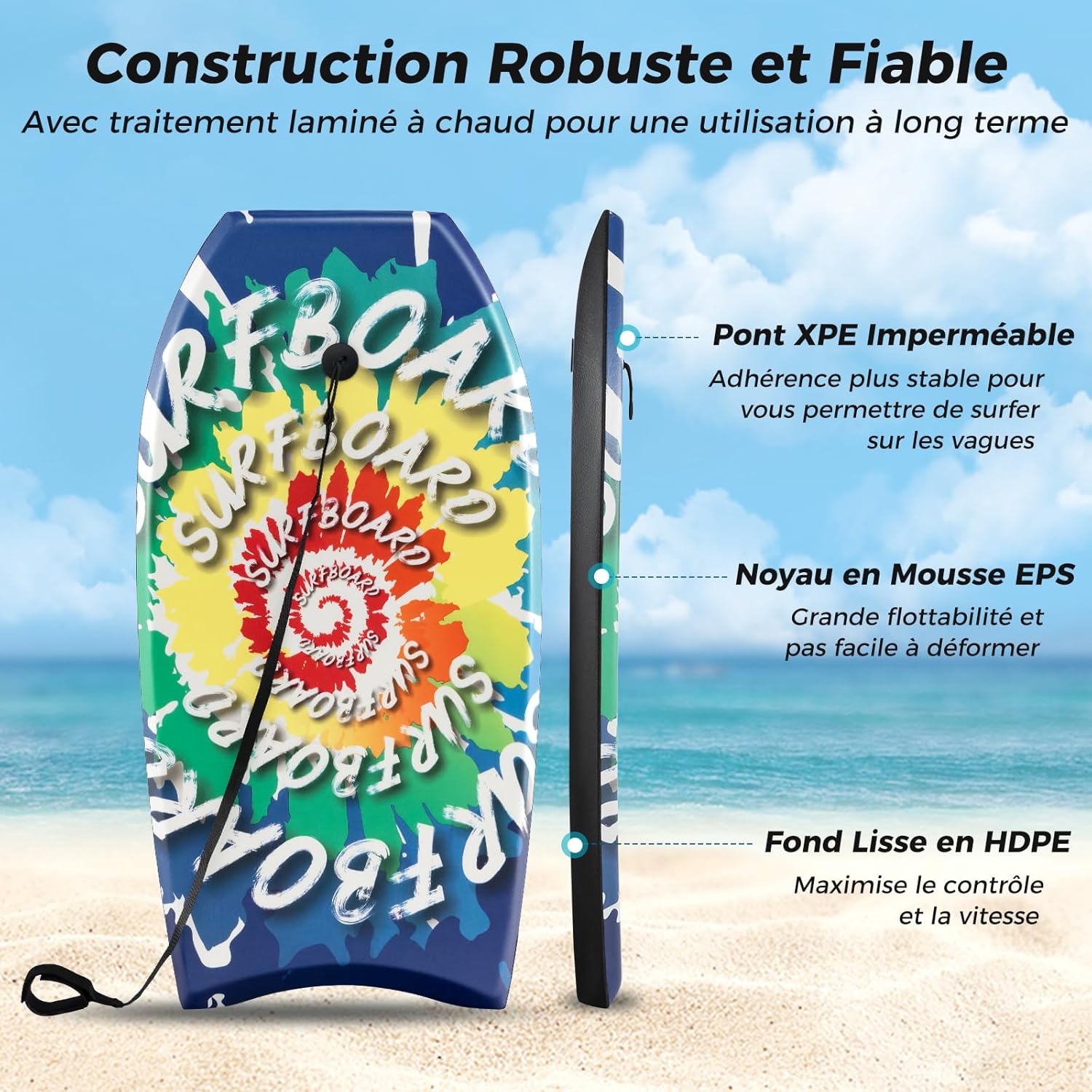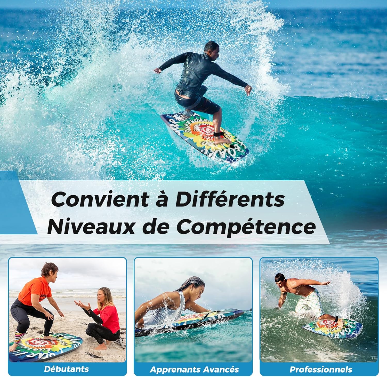 - Planche Légère et Robuste : Construite avec un noyau EPS robuste, notre planche de bodyboard est légère pour une manipulation et un transport faciles. La construction laminée à chaud offre une excellente durabilité, permettant à la planche de résister à des années de sessions de surf actives.