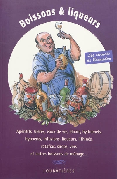 Bière de cosses de petits pois, pétillante "la modeste", hydromel russe, hypocras de fraises, malvoisie, sirop d'orgeat, ratafias de fruits, de fleurs, parfait amour, liqueur de génépi, vins d'artichauts ou de cerises, élixir des jacobins, bishof, "jaune" de papa, lithinés... et bien d'autres boissons de ménage sont rangés dans ce Carnet de Bernadou.