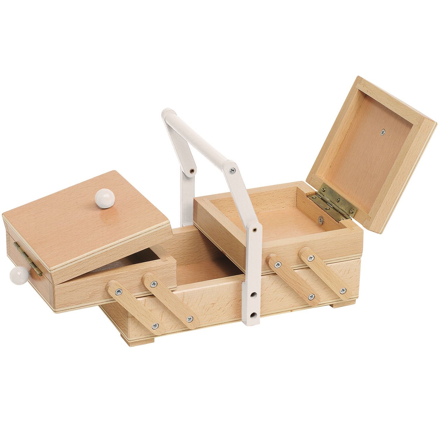 Une petite boîte à couture en bois de hêtre avec poignée blanche pour enfant.