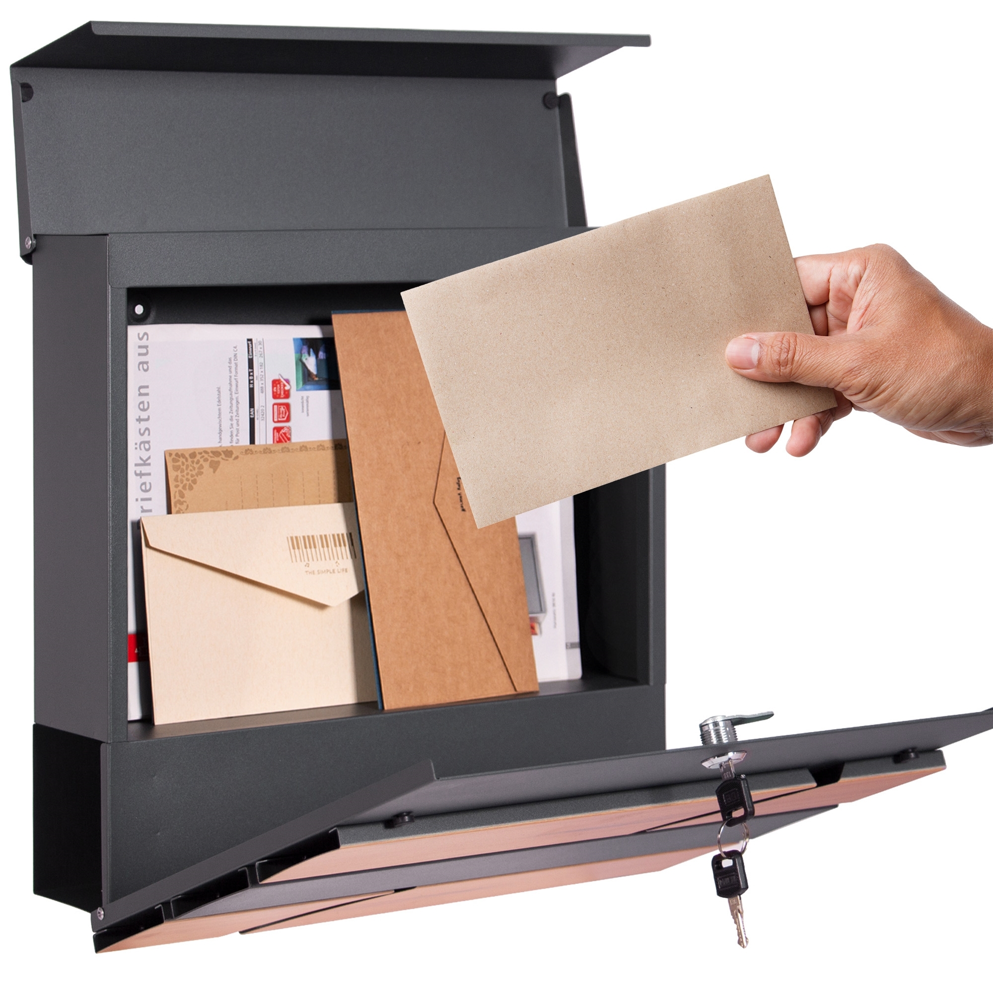 Fabriquée en acier revêtu par poudre - Ce revêtement de haute qualité est particulièrement durable et facile d'entretien. La boîte aux lettres et la fente d'introduction sont conçues de manière à ce que même les grandes enveloppes puissent y entrer sans se froisser et sans être endommagées. Grâce à la serrure et aux clés fournies, votre courrier est bien fermé.