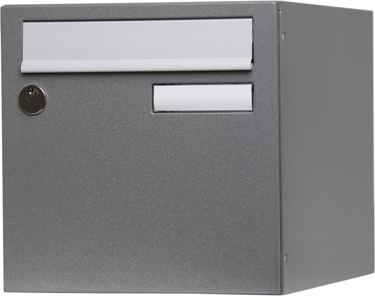 Boite aux lettres normalisée en acier revêtu métal garanti anti-corrosion 3 ans. Poudre polyester, gris moucheté. Anti‐vandale grade 2, arrachement supérieur à 15 kg. Livrée avec 2 clés. Boitier avec gouttière hydrofuge, porte recouvrante avec volet plastique équipée d’un porte‐nom affleurant en polycarbonate. 1 porte, dimensions : 285 x 285 x 385 mm.