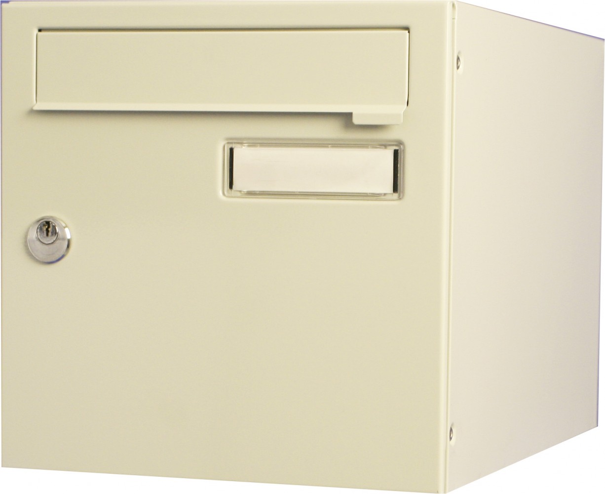 Boite aux lettres normalisée en acier revêtu métal. Poudre polyester, coloris beige, RAL 1001. Anti‐vandale grade 2, arrachement supérieur à 15 kg. Boitier avec gouttière hydrofuge, porte recouvrante avec volet en acier équipée d’un porte‐nom affleurant en polycarbonate. 1 porte, dimensions : 285 x 285 x 385 mm.