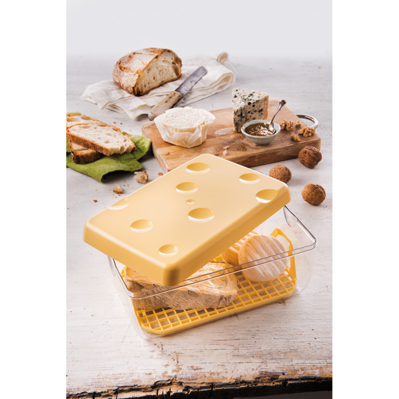 Vous allez adorer son design original avec le couvercle imitation gruyère. Cette boite conservation fromage est munie d'une grille de support et confectionnée en plastique alimentaire sans risques pour la santé.