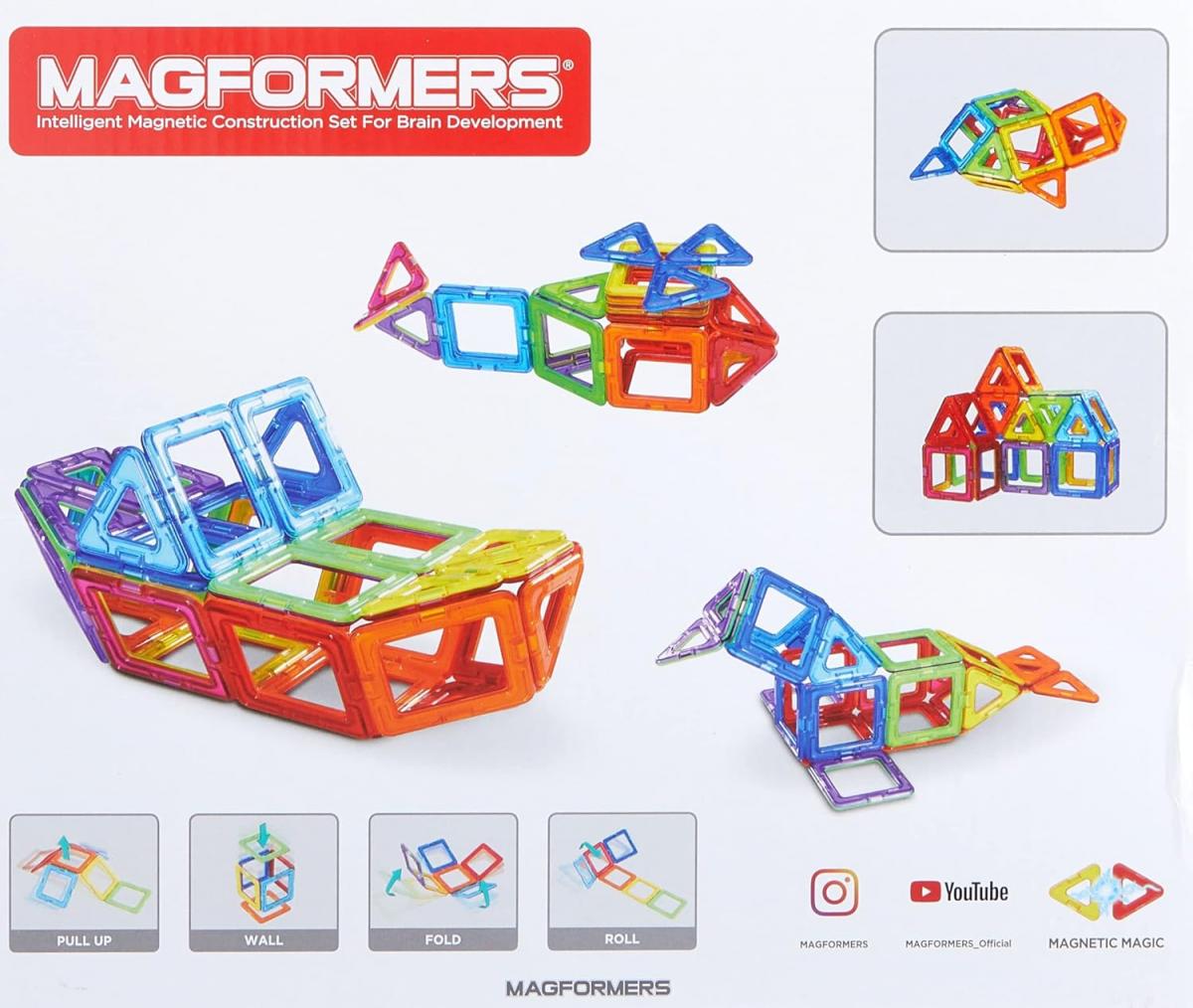 Magformers est un jeu de construction aimanté à la fois éducatif, créatif et ludique pour les petits comme pour les grands. La gamme se compose de formes géométriques basiques (carrés, triangles, rectangles, hexagones.) aux couleur vives et au design moderne. L'innovation principale des Magformers réside dans leurs aimants totalement encapsulés qui tournent sur eux-mêmes pour une connexion instantanée des formes entre elles quel que soit le sens. Les enfants peuvent ainsi transformer d'un simple geste un plan 2D en figure 3D grâce au livret de démonstration inclus dans les boites ou tout simplement inventer leur propres constructions ! Les formes géométriques s'attirent dans tous les sens, sans jamais se rejeter, permettant à l'imagination de créer à l'infini des structures en 3D. Magformers permet de découvrir les premières notions de géométrie et promet à ses petits utilisateurs des heures de concentration et de fascination tout en s'amusant.