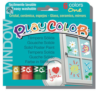 PLAYCOLOR WINDOW ONE6 Sticks de peinture gouache solide 10 g pour dessiner sur vos vitres, fenêtres, baies vitrées ou toutes autres surfaces en verre, céramique ou miroir. 6 couleurs assorties- Application facile avec des effets spectaculaires.- Ne nécessite ni eau ni pinceau.- En appuyant doucement cela donne un aspect cire et en appuyant fortement un aspect gouache.- Fort pouvoir couvrant.- Couleurs brillantes.- Aspect satiné.- Ce produit ne nettoie très facilement à l'aide d'une éponge et ne laisse pas de trace sur les surfaces utilisées après nettoyage.Séchage rapide.Nettoyage facile et rapide .Vous pourrez dessiner et peindre d'une manière plus facile, plus propre et plus amusante. Ce produit est à appliquer directement, sans ajouter d'eau.