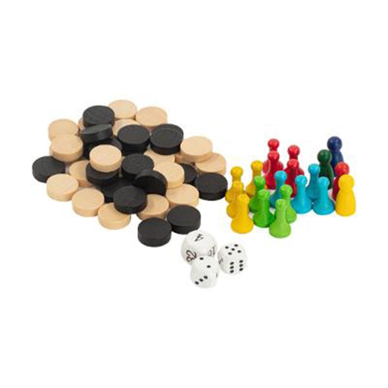 - Le jeu contient : 3 dés, 40 pièces de dame (20 pièces noires & 20 pièces naturelles), 16 pièces d'échecs avec 4 couleurs (4 pièces pour chaque couleur, jaune, vert, bleu & rouge) & 4 autres pièces (bleu, vert, rouge & jaune)