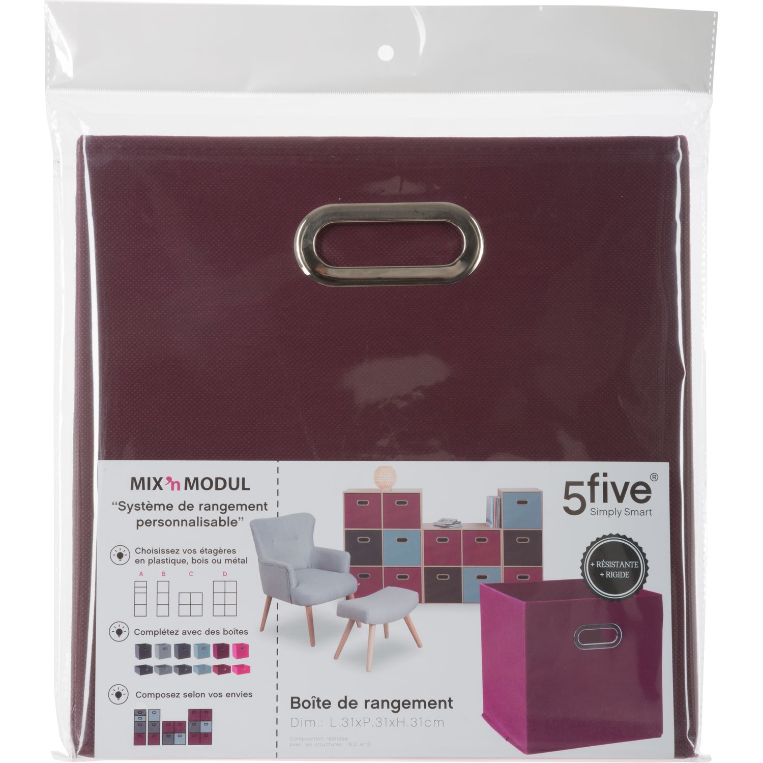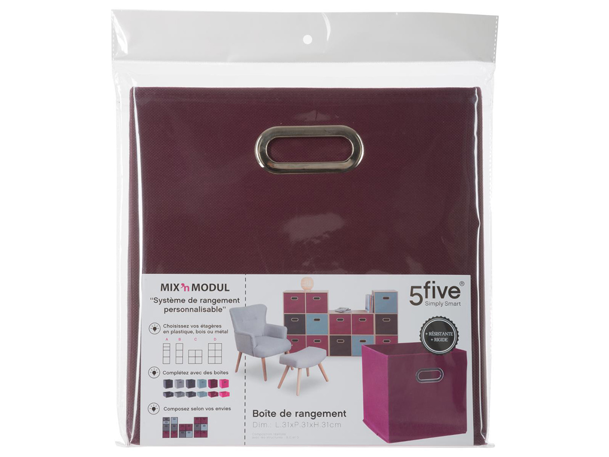 La marque 5Five® propose une large gamme de produits astucieusement pensés et designés pour tous les jours. Pour se simplifier la vie à la maison : à la cuisine ou dans la salle de bain, au garage ou à la cave, dans les placards...La marque d'objets intelligents qui améliorent le quotidien !Caractéristiques techniquesCouleur : AubergineDimensions (L x l x H) : 31 x 31 x 31 cmForme : CarréeMarque : FIVEMatière(s) : Carton, Polypropylène & MétalPoids : 0,710 kgUnivers : Moderne