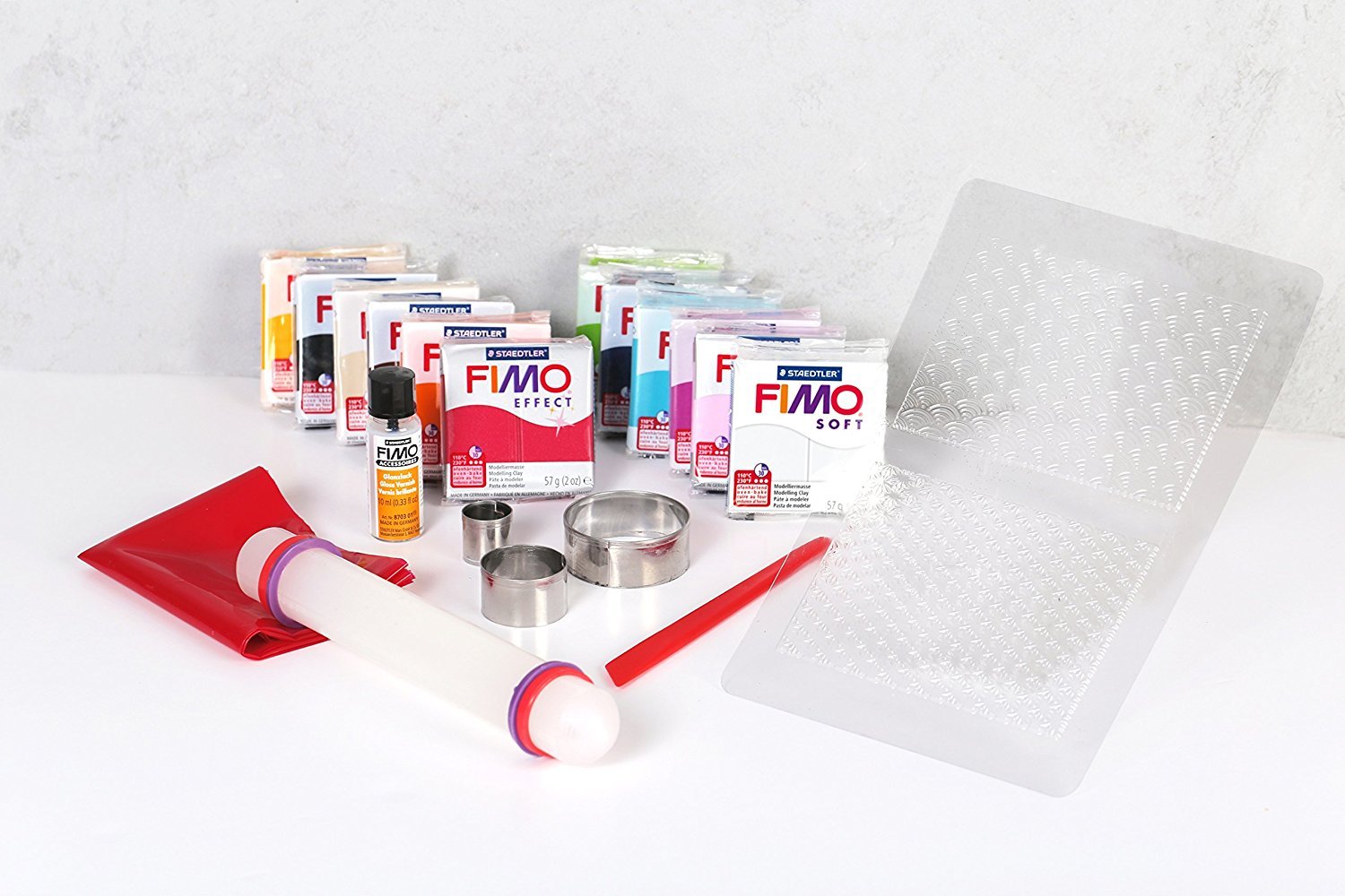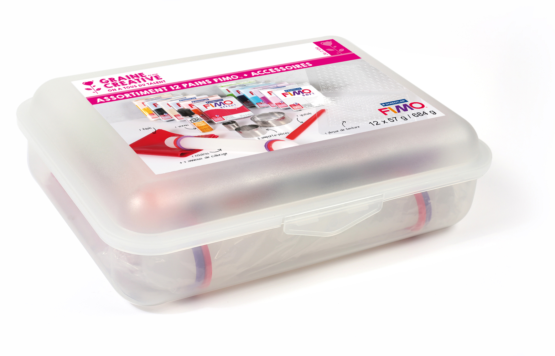 Boîte initiation Fimo 12 pains 57G et accessoires : Pâte à modeler qui durcit à la cuisson au four. Pour enfant de plus de 8 ans uniquement, à utiliser sous la surveillance d'un adulte.