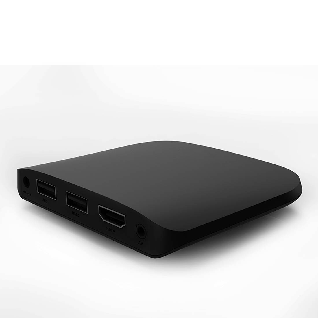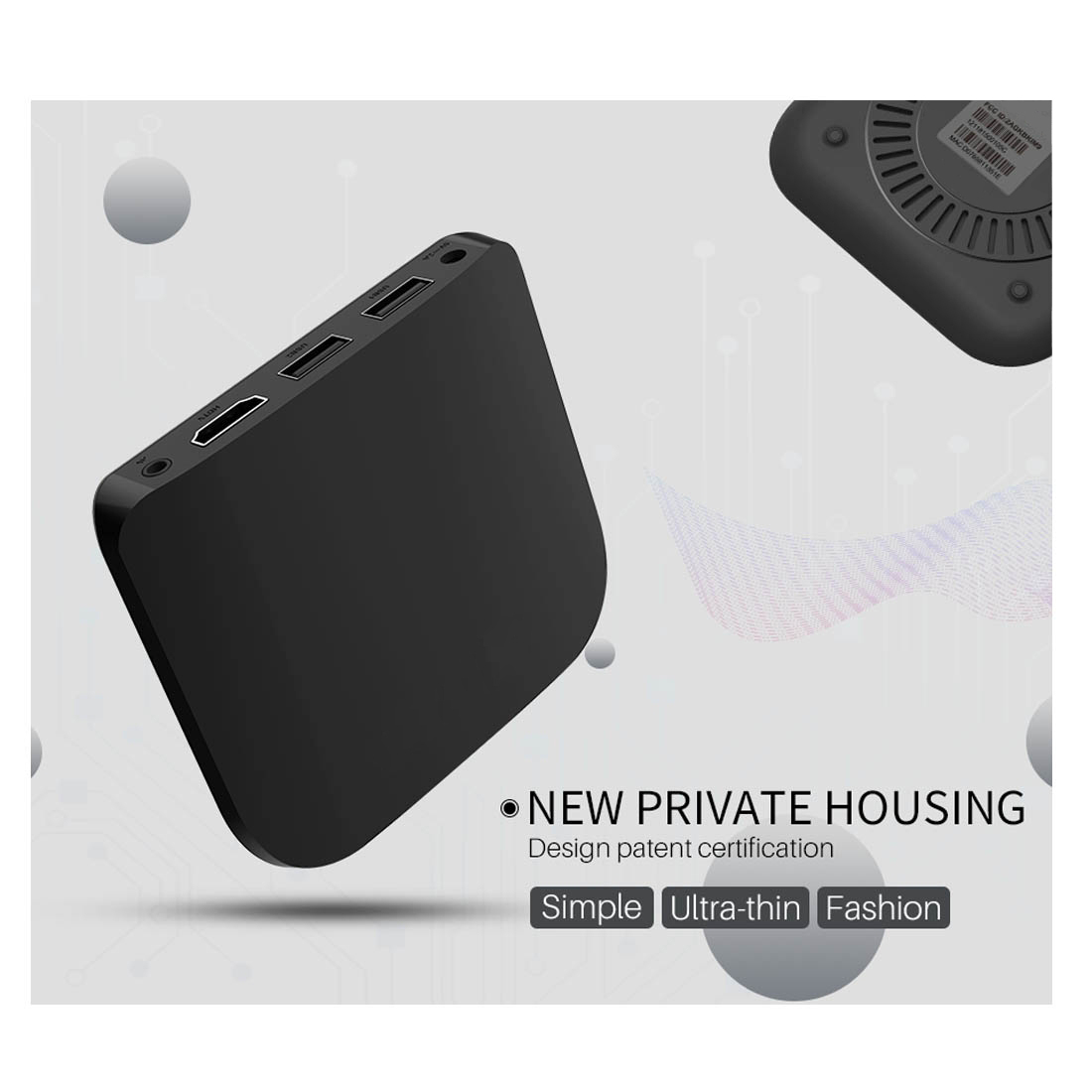Le Boîtier Smart TV Android 7.1 est petit et compact. D'une taille de 100 x 90 x 16 mm et un poids de seulement 110 g, il est facile à installer dans les environs de votre écran de télévision. Faites attention à ce qu'il soit posé sur une surface lisse et plane afin de ne pas obstruer son système d'évacuation de l'air chaud situé en dessous.