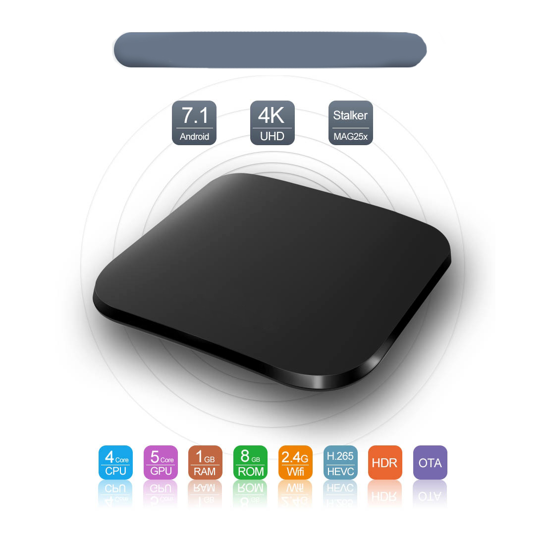 Vous trouverez sur le côté de votre Boîtier Smart TV Android 7.1 un port HDMI 2.0 et deux ports USB 2.0 qui permettent d'y brancher des périphériques de stockage tels qu'une clé USB ou un disque dur externe. L'appareil profite du Wifi 2,4 GHz pour se connecter à internet sans fil. Enfin, vous apprécierez la présence d'une télécommande infrarouge qui vous permet de contrôler votre appareil confortablement à distance.