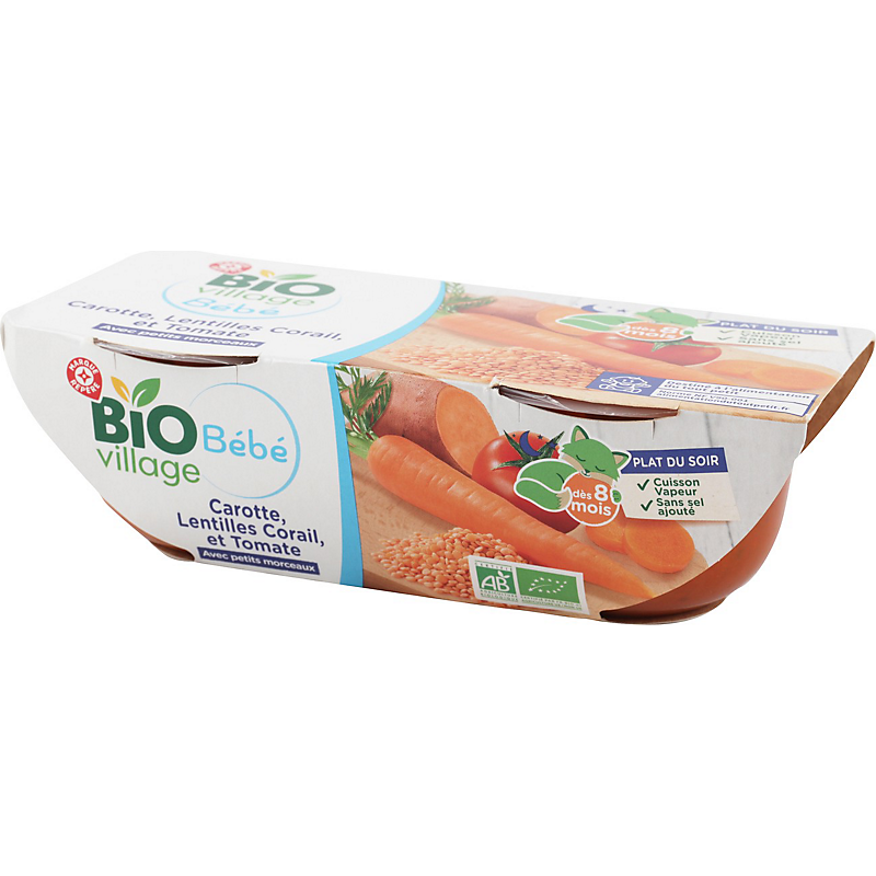 Aliment pour bébés : carotte, lentille corail et purée de tomate, stérilisé - produit issu de l'agriculture biologique BIO VILLAGE