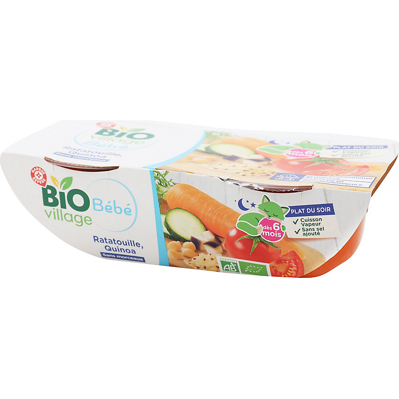 Aliment pour bébés : purée de tomate, carotte, quinoa, courgette, poivron rouge et aubergine, stérilisé - Produit issu de l'agriculture biologique BIO VILLAGE