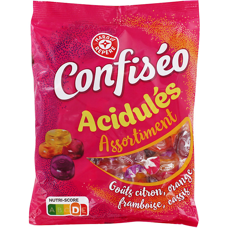 Bonbons durs acidulés goûts citron, orange, framboise, cassis CONFISEO