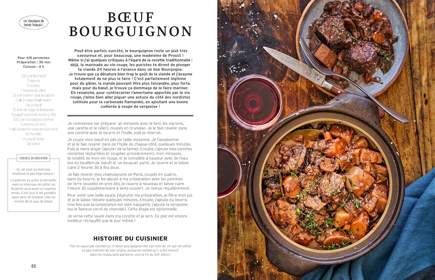 , entre grands classiques du terroir (boeuf bourguignon, cassoulet), plats qui réconcilient avec les pièces de viande oubliées (tête de veau sauce gribiche, lasagnes de joues de porc confites) et créations (côte de veau bucatini & crème de blettes, curry de cochon).