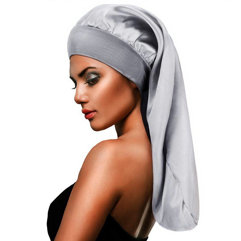 Libellé Bonnet en satin pour cheveux longs, bonnet de sommeil à bord large Silver