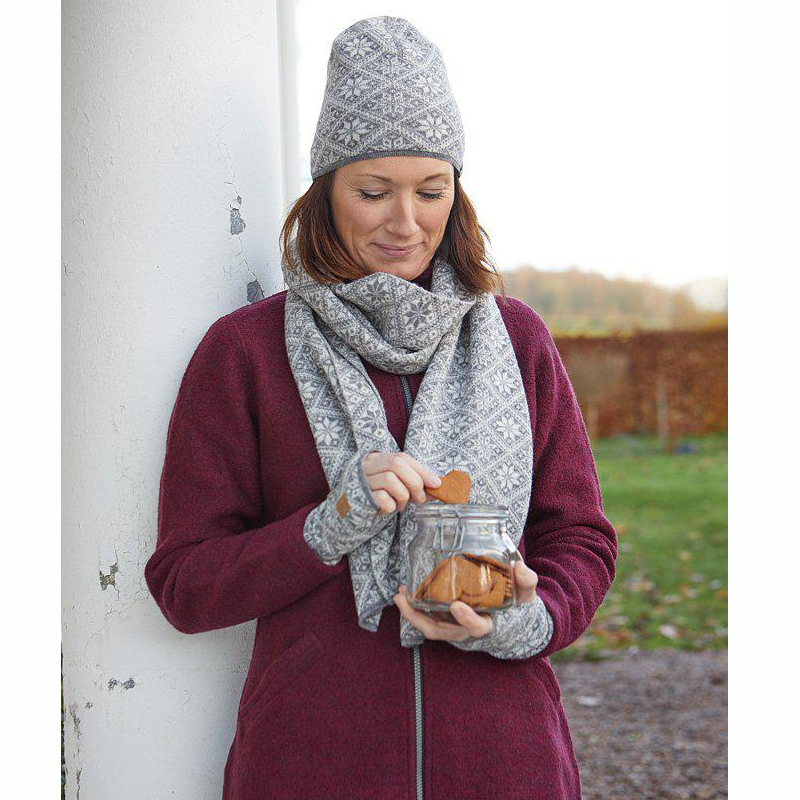 Un tricot merveilleusement tricoté chapeau avec un motif scandinave. Également disponible en écharpe et chauffe-mains.