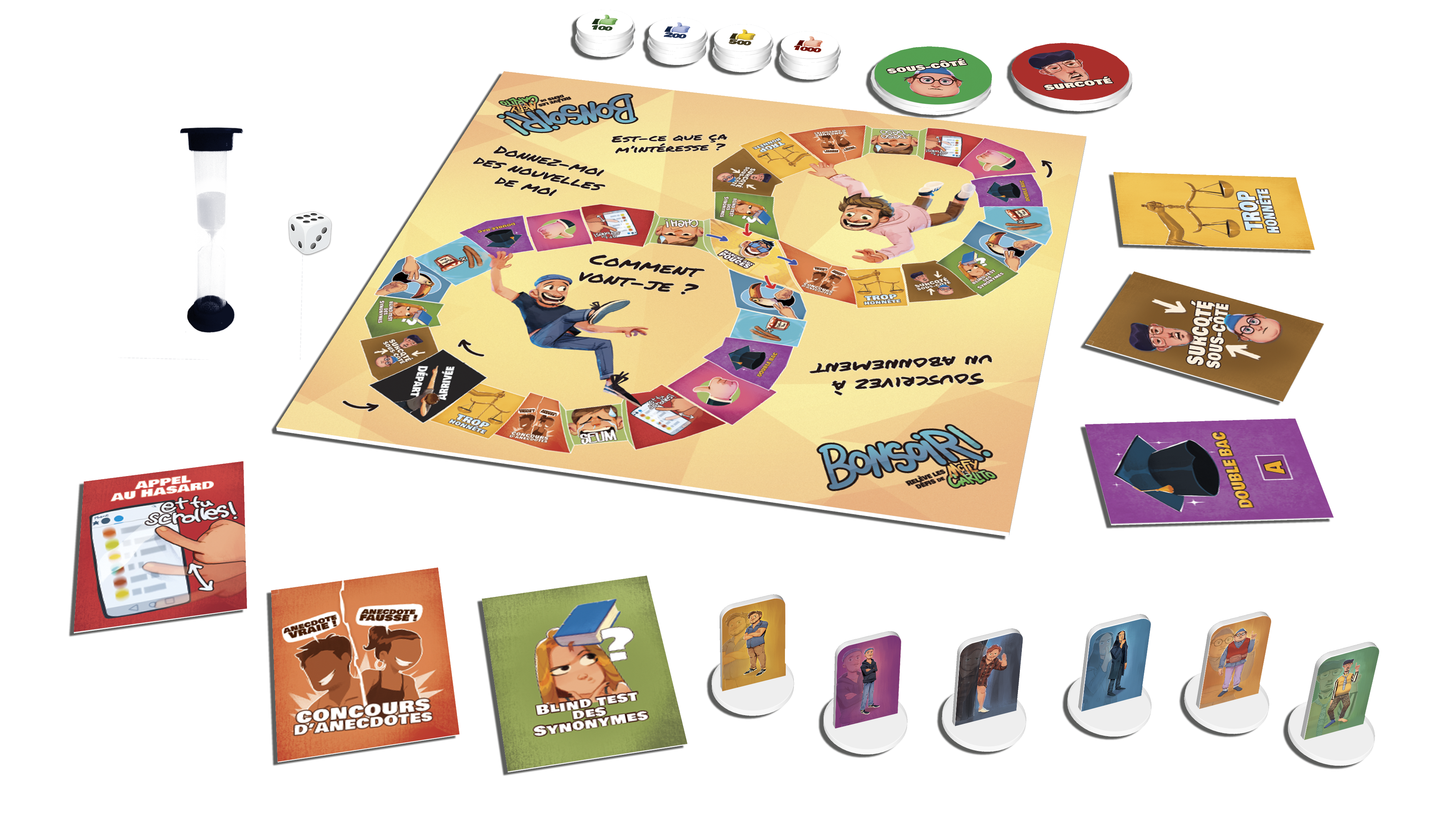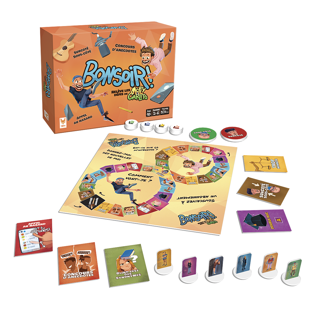Bonsoir ! Comment vont-je ? Êtes-vous prêts ? On a adapté et combiné toutes vos vidéos préférées en un seul et unique jeu de société qui, on va pas s’mentir, défonce. Chaque case du plateau vous invite à relever un défi : On appelle des gens au hasard, Concours d’anecdotes, Mix’N’Twist, Blind test des synonymes, le double BAC, Surcoté/Sous-côté et d’autres encore. ALORS, QUI D’ENTRE VOUS OBTIENDRA LE PLUS DE LIKES ?