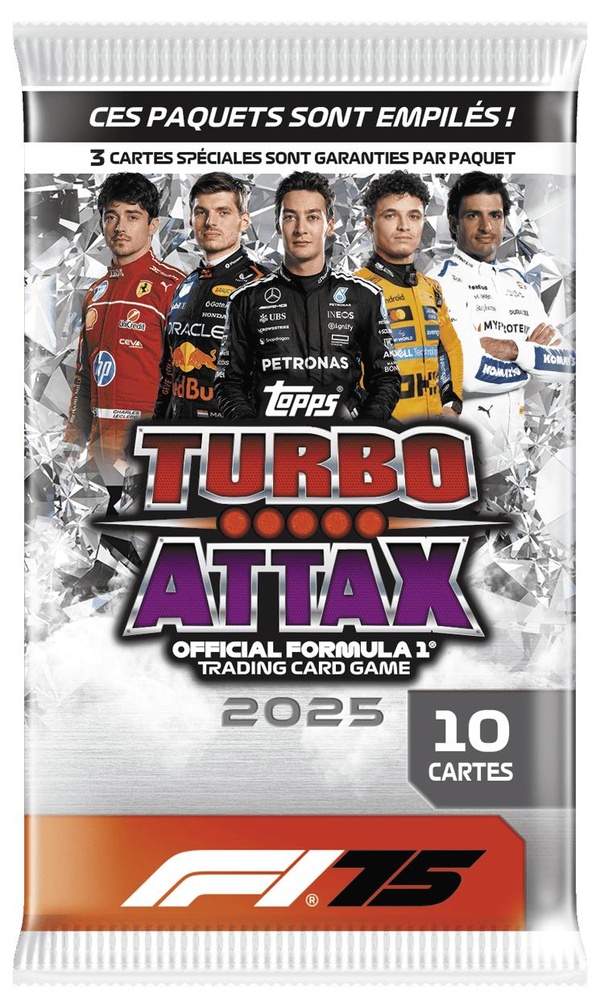 SACHET DE 10 CARTES, 8 CARTES CLASSIQUES,2 CARTES HOLOGRAPHIQUES AVEC EFFET DIAMANT Rejoins-nous pour célébrer le 75ème anniversaire de ce sport. La saison 2025 promet de nouvelles cartes des stars du paddock, y compris les nouveaux pilotes Antonelli, Doohan, Bortoleto et Bearman, ainsi que le septuple champion du monde de Formule 1 FIA Lewis Hamilton, qui fait ses débuts avec Scuderia Ferrari !Retrouve des cartes en édition limitée telles que Aquamarine et Amethyst, ainsi que Chilli correspondant à Carlos Sainz « the Smooth Operator », alors qu'il se lance dans un nouveau défi avec Williams Racing.Découvre les nouvelles cartes holographiques avec un effet diamant, dont une nouvelle version numérotée de 1 à 75 - une carte pour chaque année de la glorieuse histoire de ce sport. Également, une sélection iconique des nouvelles légendes de la F1 t'attend pour compléter ta collection.