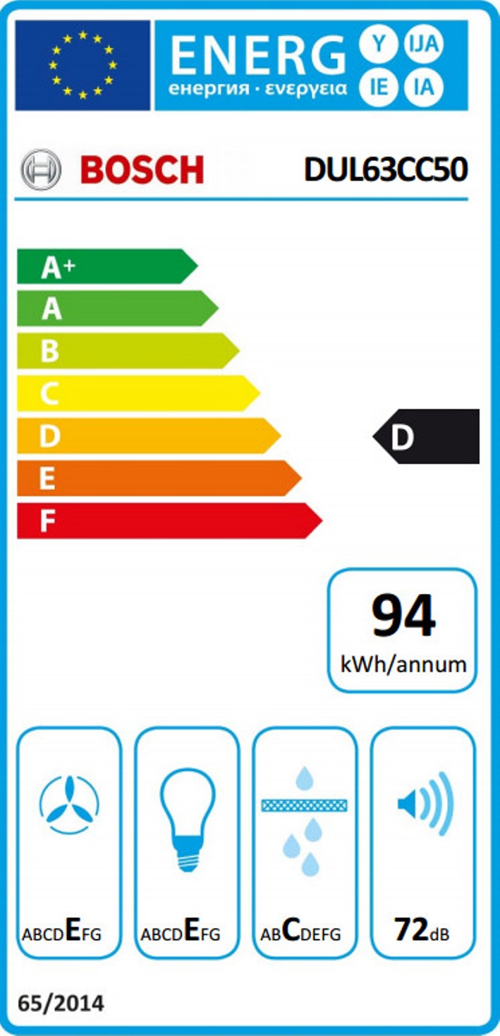 Bosch DUL63CC50. Puissance d'extraction maximum: 350 m³/h, Type d'extraction: Conduit / Recirculation, Classe d'efficacité dynamique du fluide: E. Type: Montée au mur, Couleur du produit: Acier inoxydable, Type de commande: Boutons. Type de filtre à graisse: Aluminium. Puissance de l'ampoule: 4 W, Nombre d'ampoules: 2 ampoule(s), Type d'ampoule: LED. Classe d'efficacité énergétique: D, Consommation annuelle d'énergie: 93,3 kWh, Plage d’efficacité énergétique: A+ à F