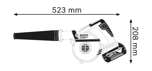 Bosch GBL 18V-120 Professional. Type: Souffleur à main, vitesse de l'air: 270 km/h, Couleur du produit: Noir, Bleu. Tension des piles: 18 V. Largeur: 523 mm, Profondeur: 208 mm, Poids: 1,1 kg. Largeur du colis: 210 mm, Profondeur du colis: 303 mm, Hauteur du colis: 190 mm