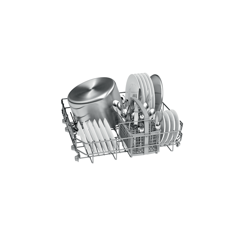 Le panier supérieur est réglable en hauteur pour loger des assiettes plus grandes dans le panier inférieur.
