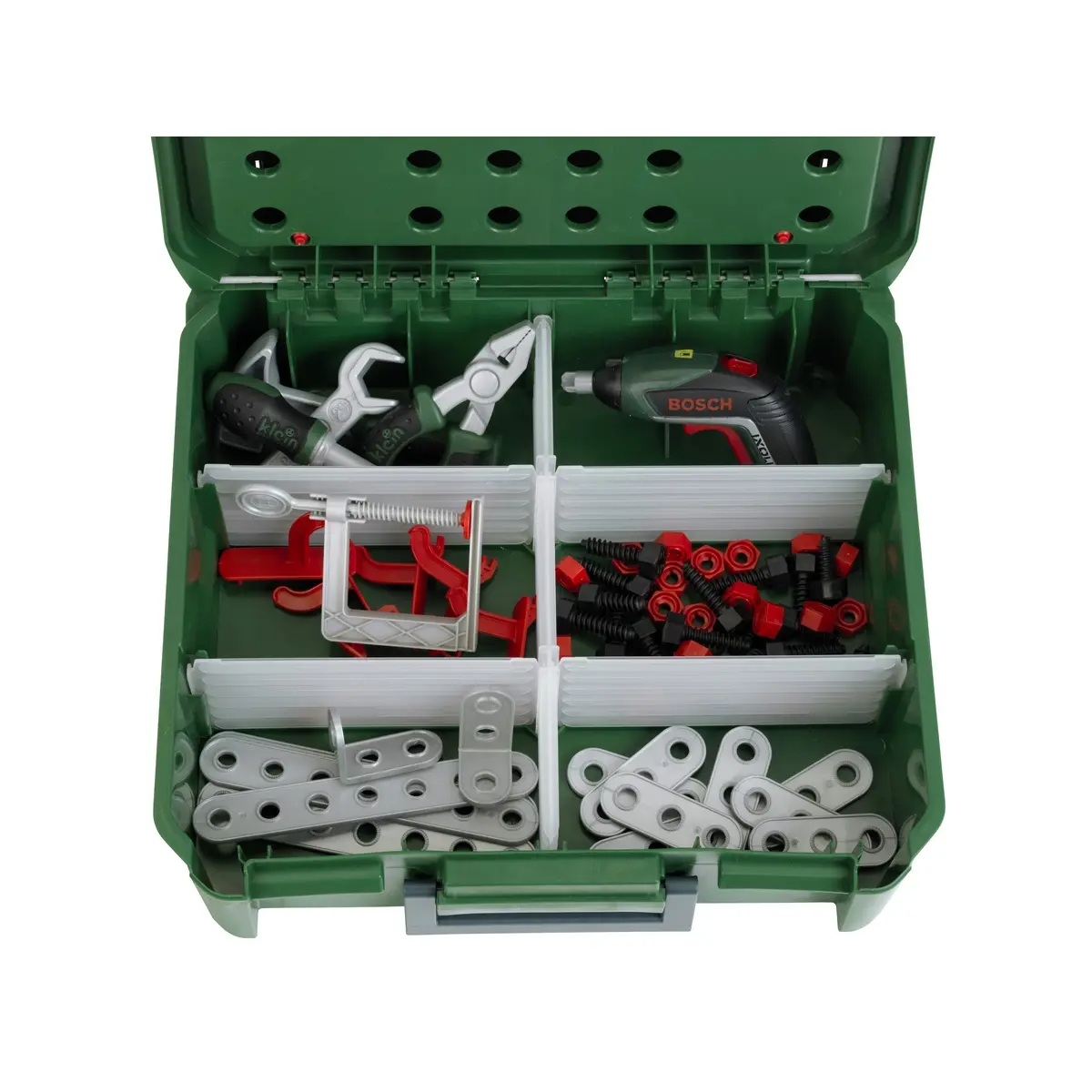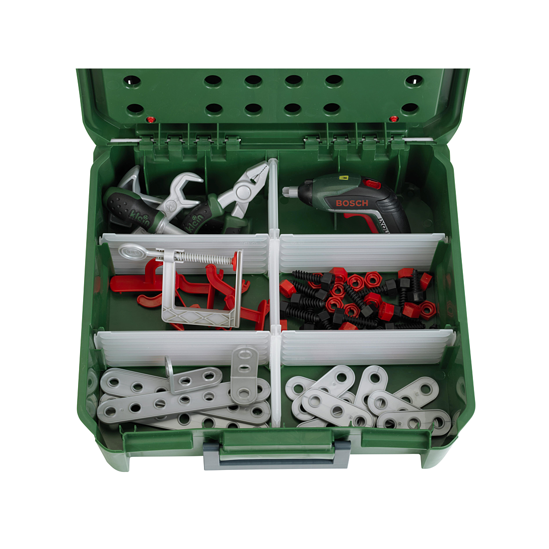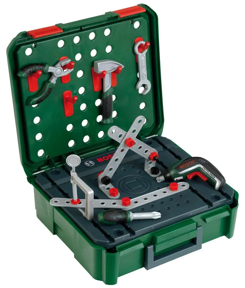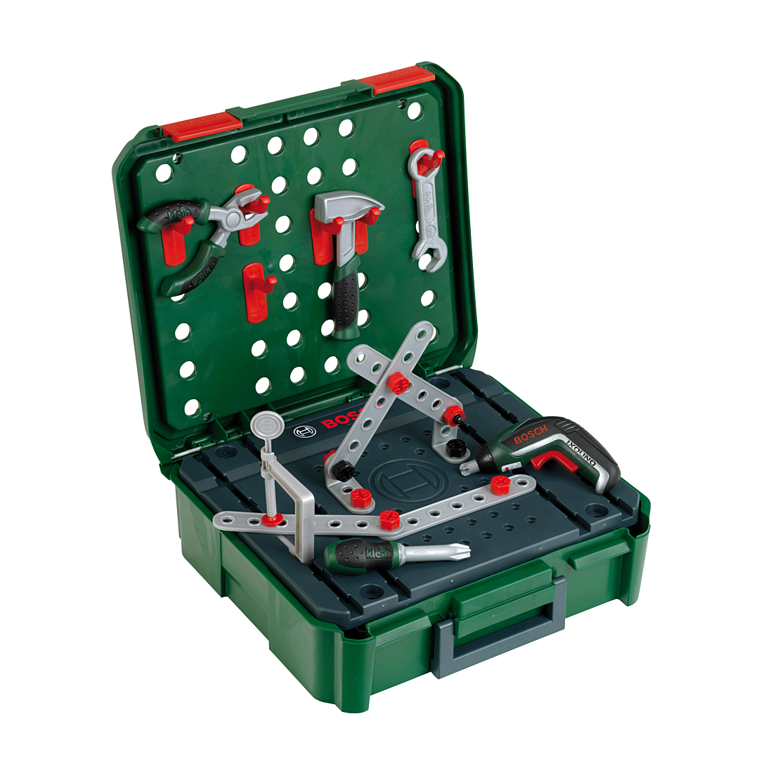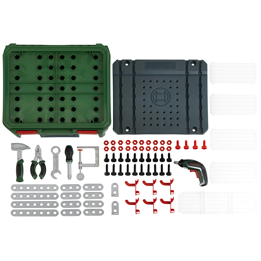 Cette mallette-établi sous licence BOSCH offre de nombreuses possibilités de jeux. Le couvercle supérieur peut servir de panneau pour y accrocher des outils. La partie grise qui se trouve à l‘extérieur peut également servir de plan de travail.Tu peux organiser l‘intérieur de ta mallette en créant des compartiments de rangement.Livrée avec de nombreux accessoires : pince, marteau, clé plate, tournevis, vis, lattes, écrous, etc...Et une superbe visseuse Ixolino II aux fonctions électroniques réalistes : bruitage, fonction lumineuse, double sens de rotation et embouts interchangeables. Dimensions de la mallette : 36 x 38,5 x 43 cm. A partir de 3 ans. Fabriquée en Allemagne