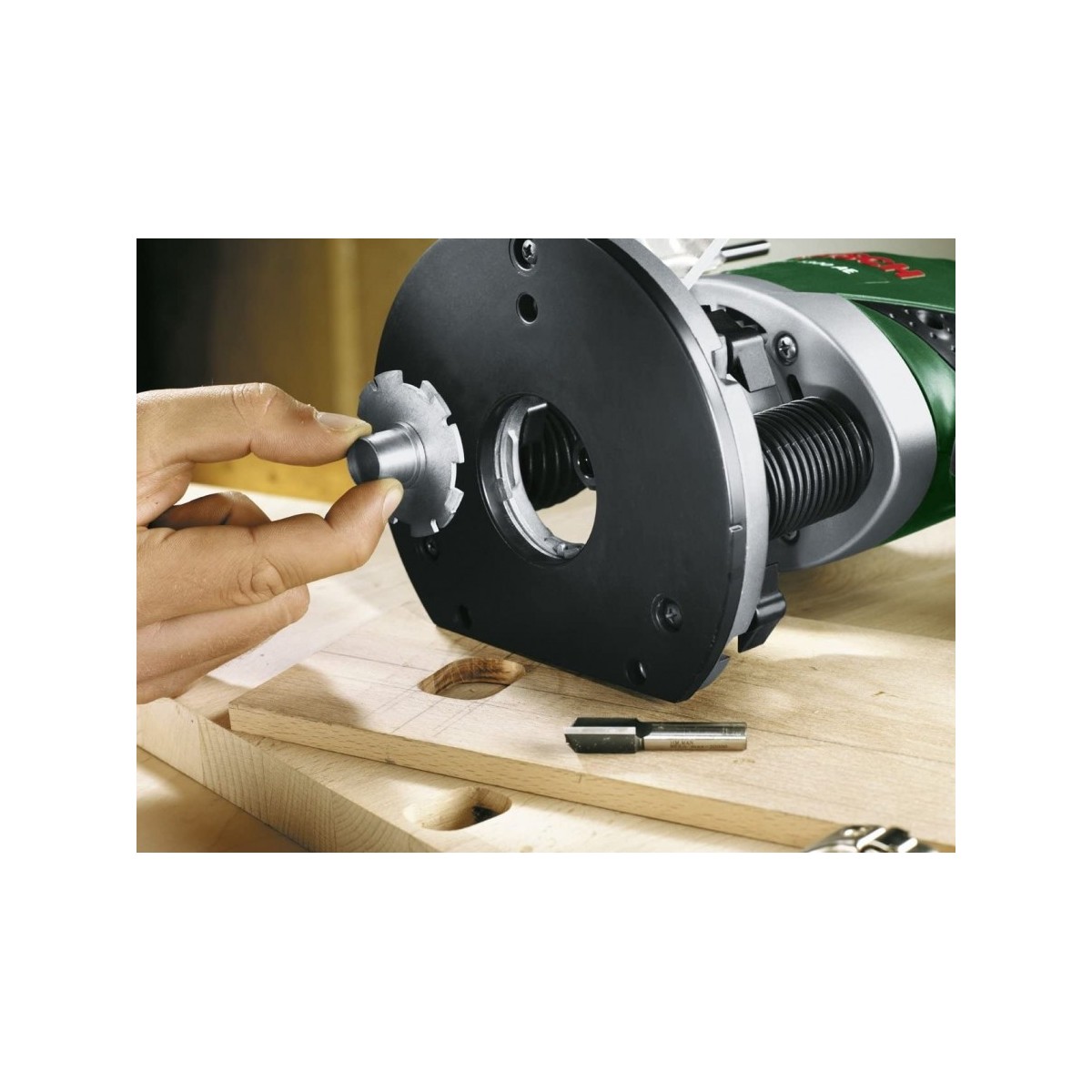 La défonceuse Bosch offre au bricoleur un certain nombre de caractéristiques techniques qui facilitent grandement le défonçage. Le moteur de 1 200 W assure un bon entraînement de la fraise dans tous les types de bois. La régulation électronique du régime Bosch, avec molette et gâchette sensible à la pression, permet, quant à elle, de régler le régime entre 11 000 et 28 000 tours par minute pour travailler de manière toujours précise dans les différents matériaux. À cela s’ajoutent un blocage de broche, pour un changement de fraise simple et rapide, une butée de profondeur rotative à trois positions et un système SDS, pour un montage sans outil de la bague de copiage.