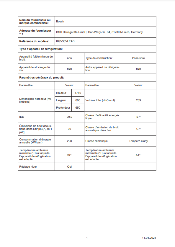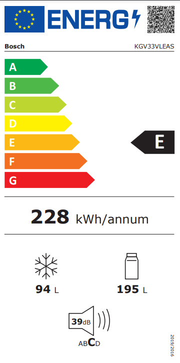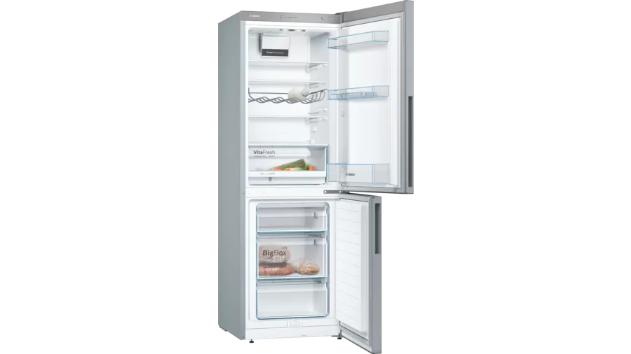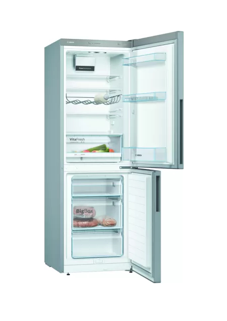 Bosch Serie 4 KGV33VLEAS. Capacité nette totale: 289 L. Emplacement charnière de porte: Droite, Type d'écran: LED. Classe climatique: SN-T, Niveau sonore: 39 dB. Capacité nette du réfrigérateur: 195 L, Lumière intérieure du réfrigérateur, Nombre de clayettes/bacs du réfrigérateur: 4, Nombre de tiroirs à légumes: 1. Capacité net du congélateur: 94 L, Capacité de congélation: 7 kg/24h. Nouvelle zone compartiment. Classe d'efficacité énergétique: E, Consommation annuelle d'énergie: 228 kWh. Couleur du produit: Acier inoxydable