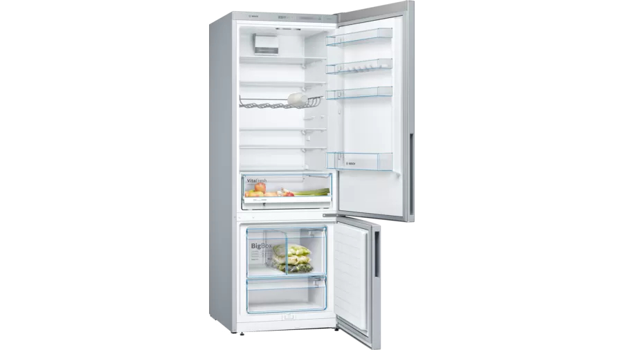 Réfrigérateur combiné largeur 70 cm - Réfrigérateur : 376 L - Dégivrage automatique - Froid brassé PowerVentilation - Clayette porte-bouteilles - 4 clayettes verre dont 3 coulissantes EasyAccess : clayette en verre rétractable pour faciliter le chargement et le déchargement - Compartiment VitaFresh avec contrôle d'humidité : les fruits et légumes restent frais et riches en vitamines plus longtemps - Eclairage LED. Congélateur : 124 L - Technologie LowFrost : décongelez moins souvent grâce à la faible quantité de formation de glace pour un gain de temps et des économies en énergie - 2 tiroirs dont 1 BigBox - VarioZone avec clayettes amovibles - Fonction Super congélation - Régulation électronique FreshSense avec affichage LED : température constante par technologie de capteurs intelligents - Ouverture de porte sans débord à 90° - Poignées intégrées - Finition Look inox. Volume total : 503 l Classe d'efficacité énergétique Classe énergie_Eu19: E sur une échelle allant de A à G Consommation énergétique : 266 kWh/an Pour atteindre la consommation d'énergie annoncée, les butées de ventilations jointes doivent être utilisées. En conséquence, la profondeur de l'appareil s'accroît d'environ 3,5 cm. L'appareil utilisé sans ces butées est parfaitement fonctionnel, mais a une consommation sensiblement plus élevée. Technologie LowFrost Système PowerVentilation.