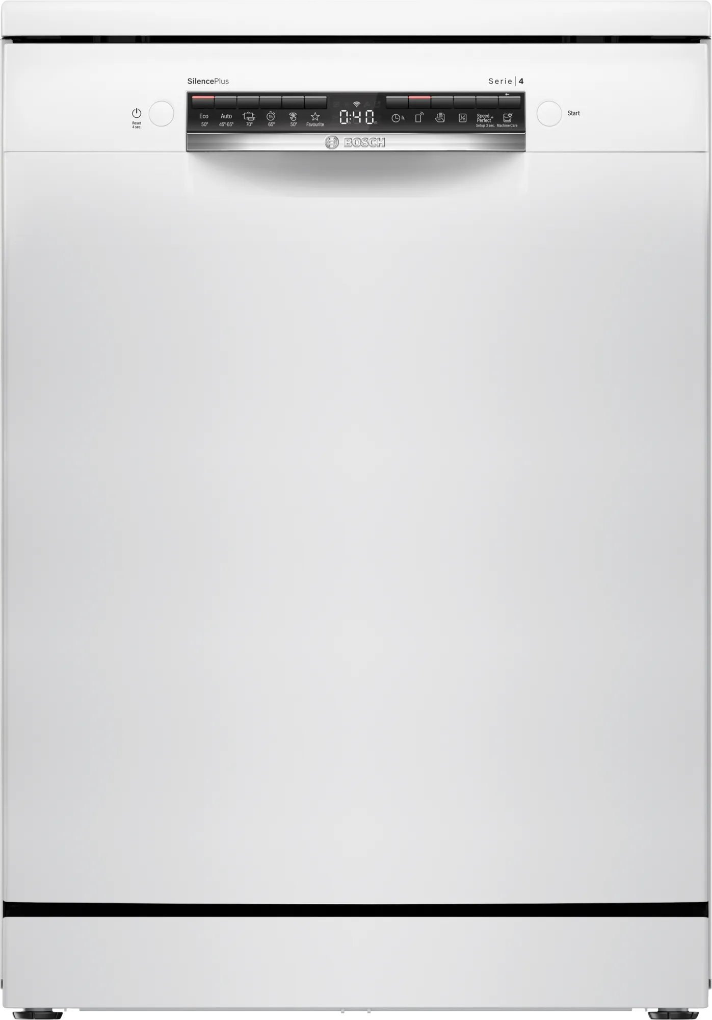 Bosch Serie 4 SMS4ETW00E. Placement de l'appareil: Pose libre, Taille du produit: Taille maximum (60 cm), Couleur de la porte: Blanc. Nombre de couverts: 13 couverts, Classe d'émission sonore: B, Niveau sonore: 44 dB. Réglage des pieds: 2 cm, Apps de contrôle prises en charge: Bosch Home Connect. Classe d'efficacité énergétique: C, Consommation d'eau par cycle: 9 L, Consommation d'énergie pour 100 cycles: 74 kWh. Largeur: 600 mm, Profondeur: 600 mm, Hauteur: 845 mm