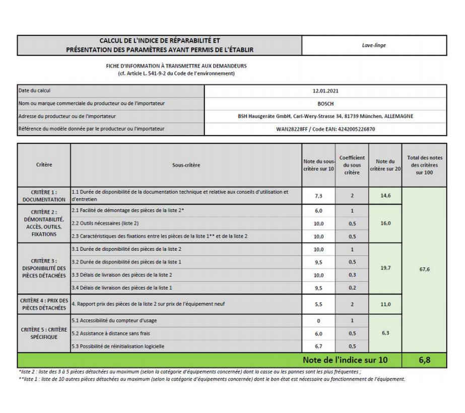 Indice de réparabilité 6,8 / 10