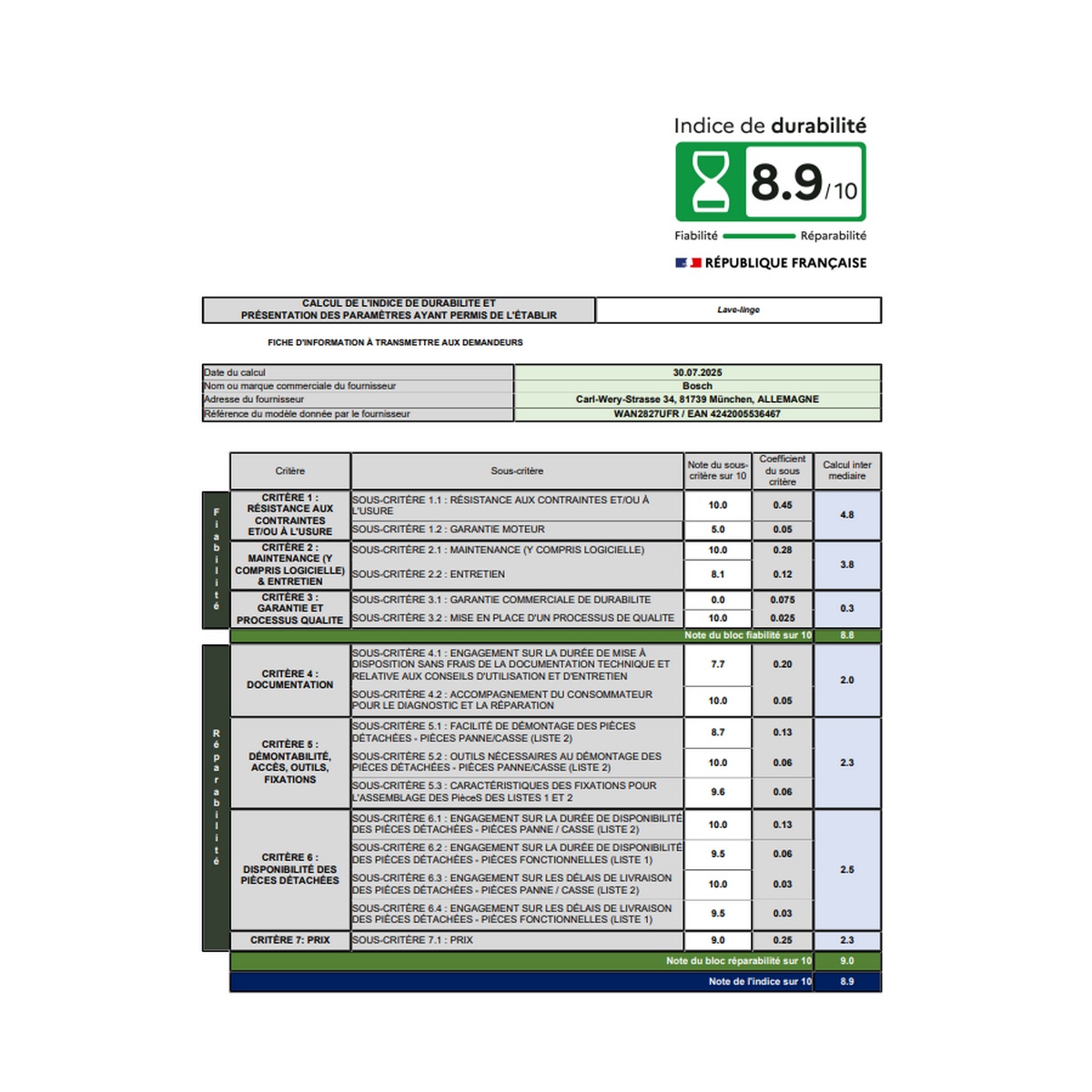 Autre(s) information(s) Moteur EcoSilence Drive garanti 10 ans; Iron Assist vapeur; ActiveWater Plus; Indice de réparabilité 9/10; Hublot Ø32 cm; ouverture 160°