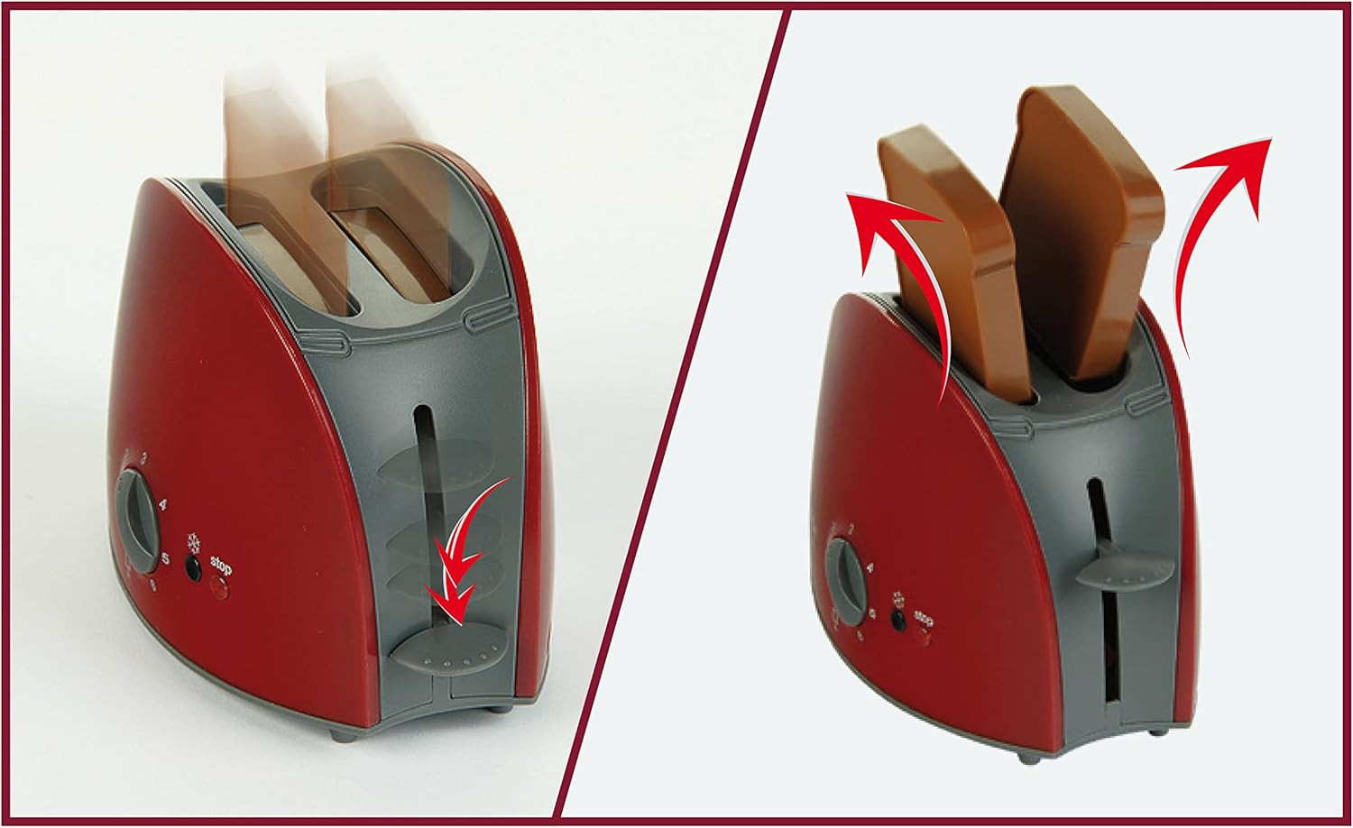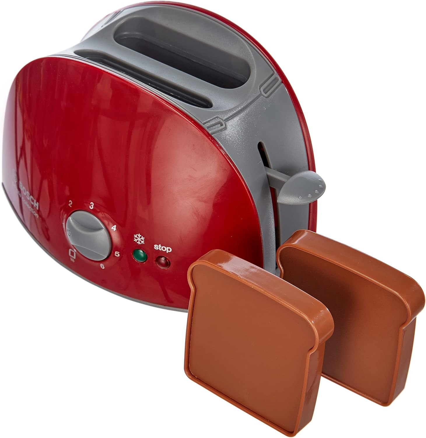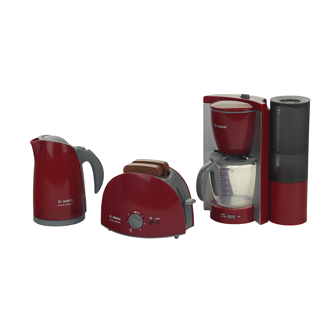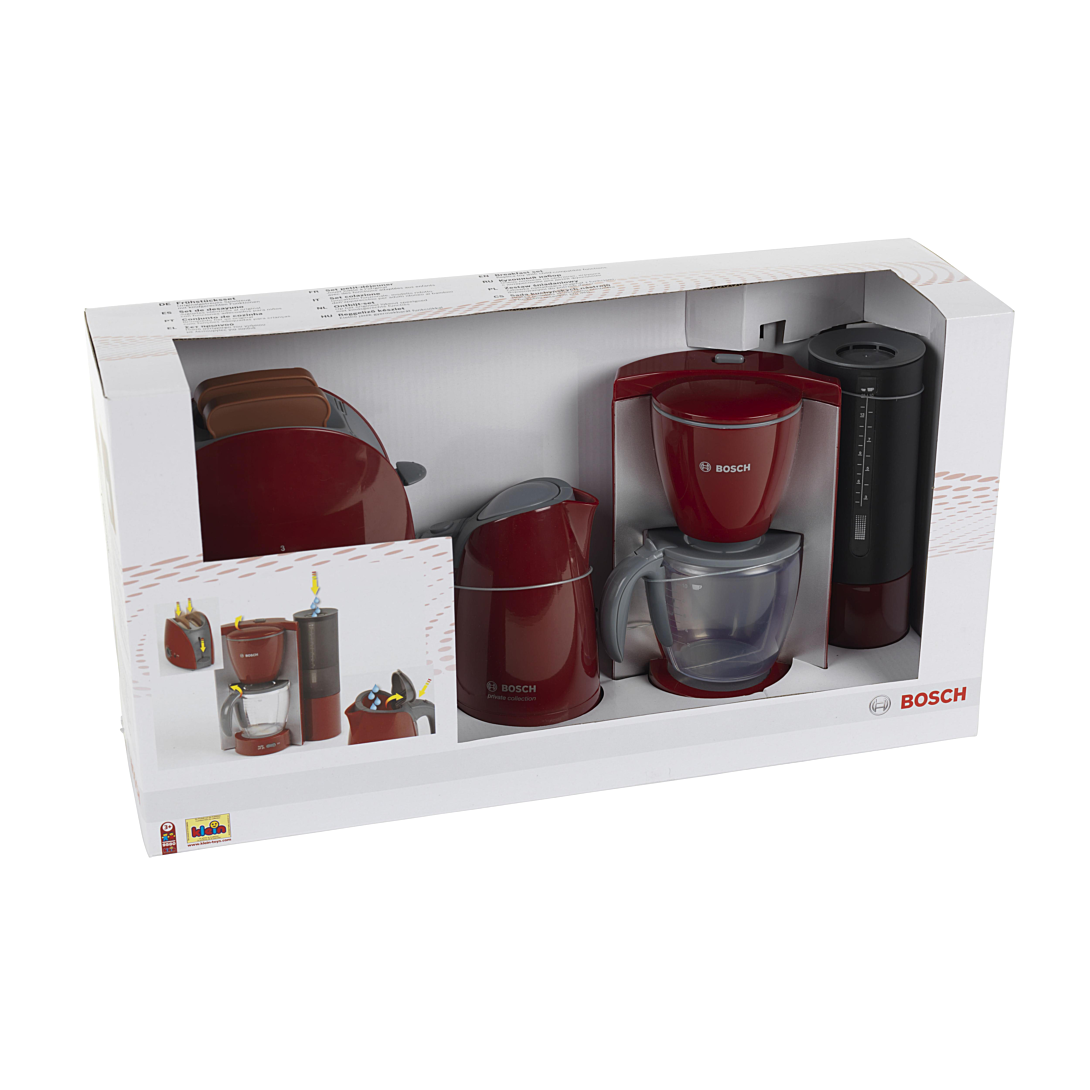 Set de petit déjeuner Bosch avec des appareils électroménagers aux fonctions réalistes. Une bouilloire pouvant être remplie d'eau, un grille-pain avec fonction mécanique d'éjection des toasts et une cafetière avec fonction d'écoulement d'eau. Reproduction fidèle des originaux. A partir de 3 ans.