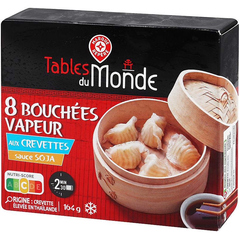 Bouchées vapeur garnies d'une farce aux crevettes (18 g pièce) : Eau ; crevette 17,5 % ; amidon de blé ; chou ; amidon de tapioca ; amidon de pomme de terre ; carotte ; oignon ; jicama ; farine de blé ; cébette ; huile de son de riz ; sauce soja (eau, sel, soja, farine de blé, riz, alcool) ; huile de sésame ; sucre ; sel ; poivre blanc. Pourcentage exprimé sur la bouchée vapeur.