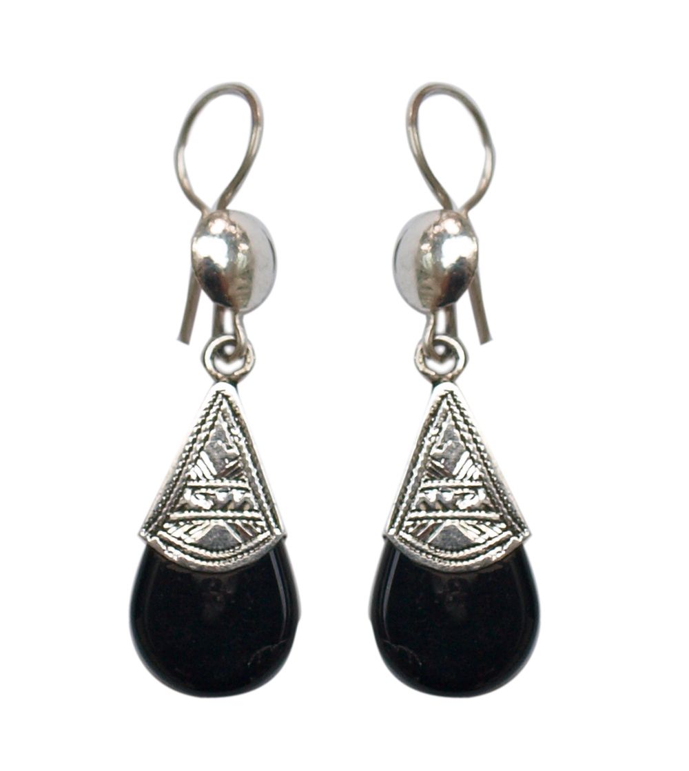 Fabrication artisanale - Boucles d'oreilles en forme de goutte en agate noire et suspendue à triangle aux motifs ethniques en argent martelé et ciselé. Dimension : 4x1,2cm - Poids : 0.5gr - Argent