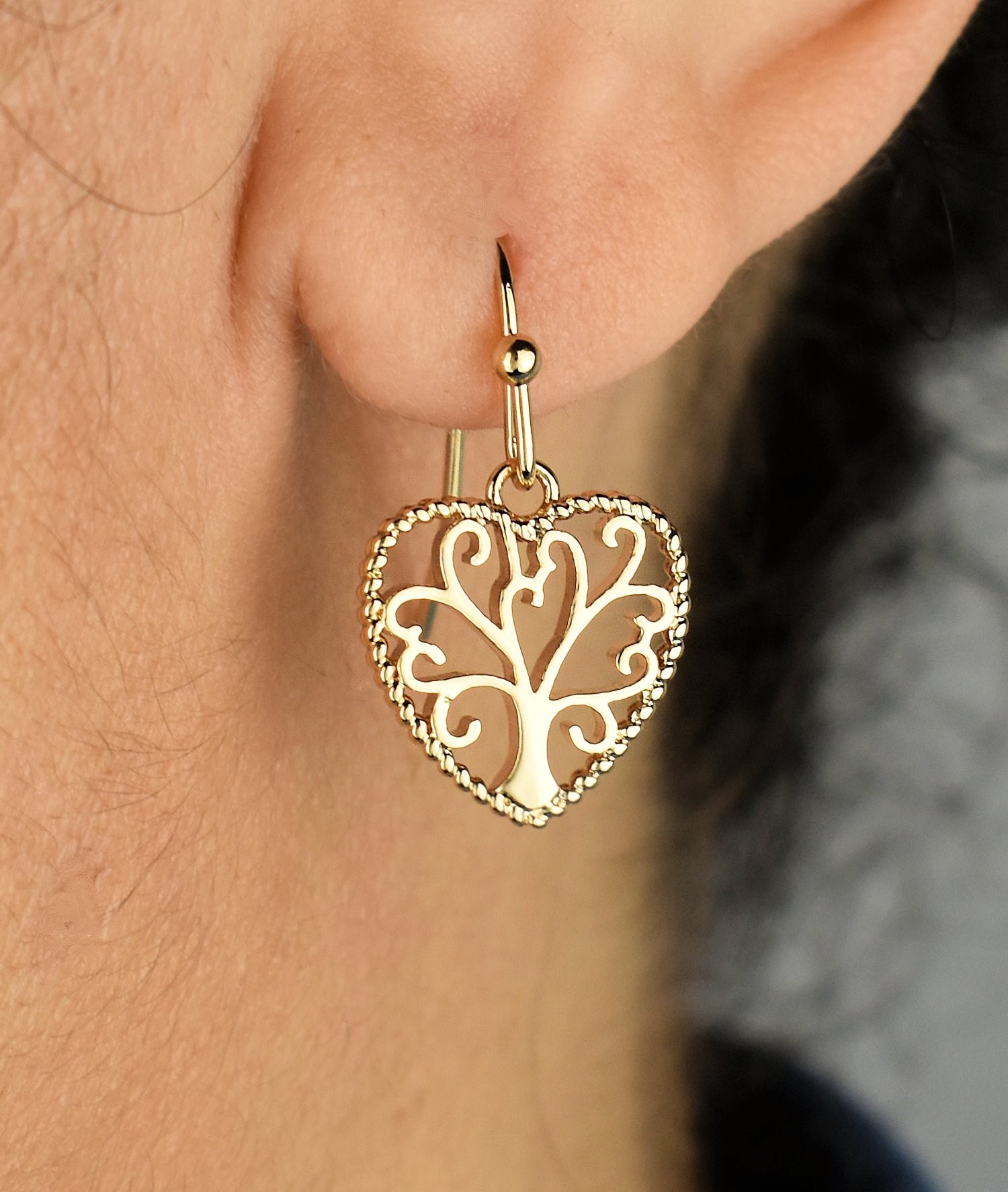 Libellé Boucles d'oreilles arbre de vie dans un coeur Plaqué OR 750 3 microns