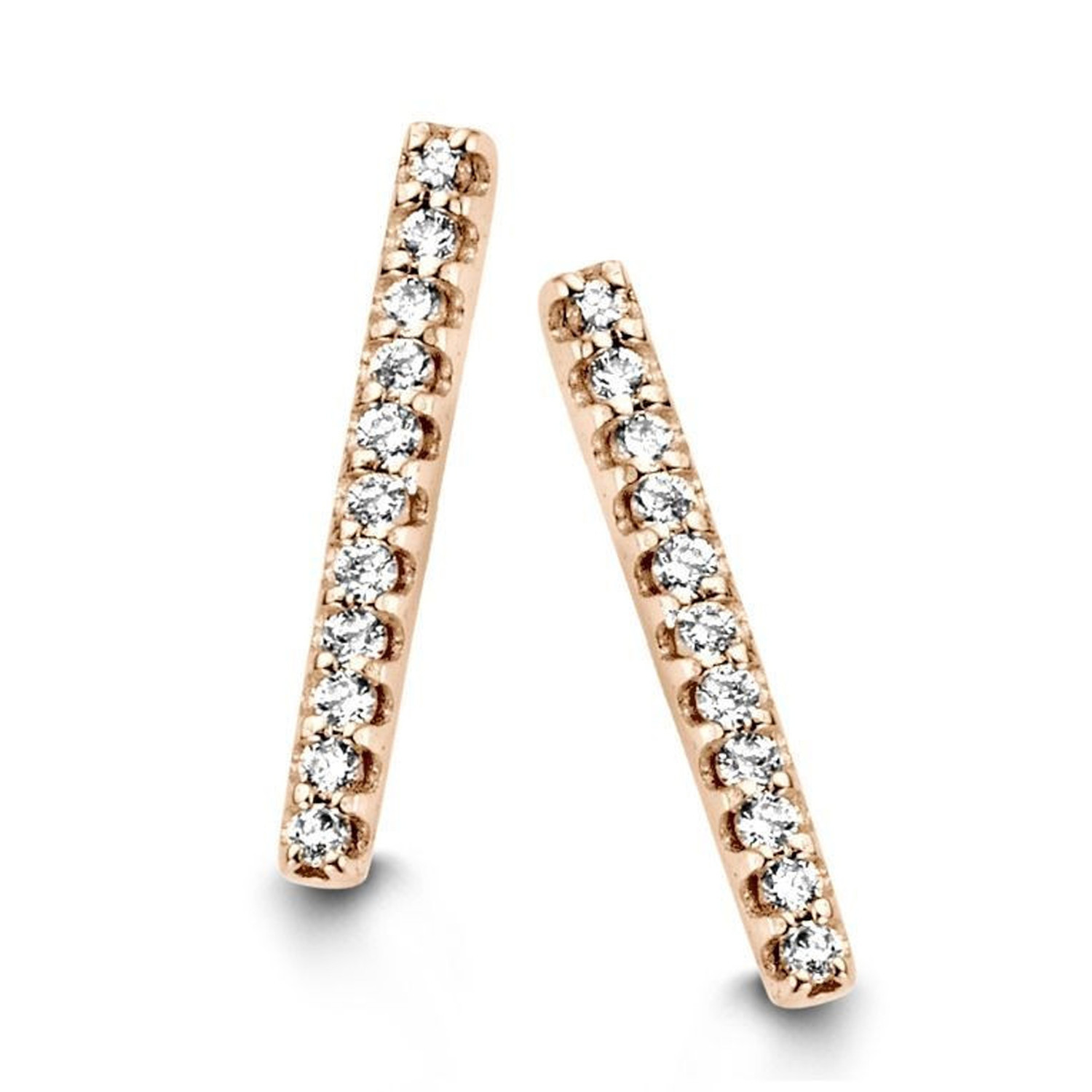 Boucles d'oreilles de forme barrette en or rose 750/1000 serties de 11 diamants chacune. Longueur 12 mm, largeur 1.5 mm, système de fermeture à poussettes. Elles sont livrées dans un écrin avec leur certificat d'authenticité.