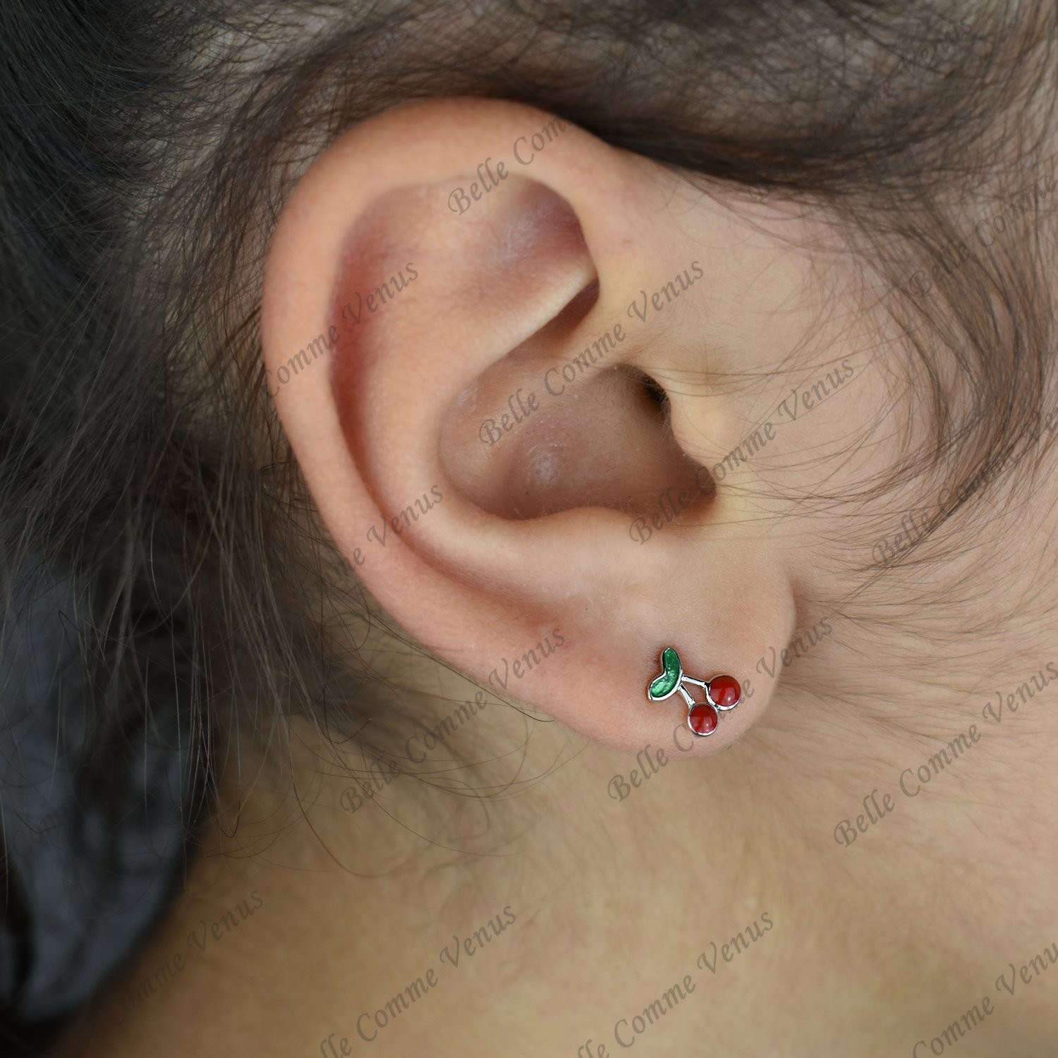 Libellé Boucles d'oreilles cerise émail rouge et vert Argent 925 Rhodié