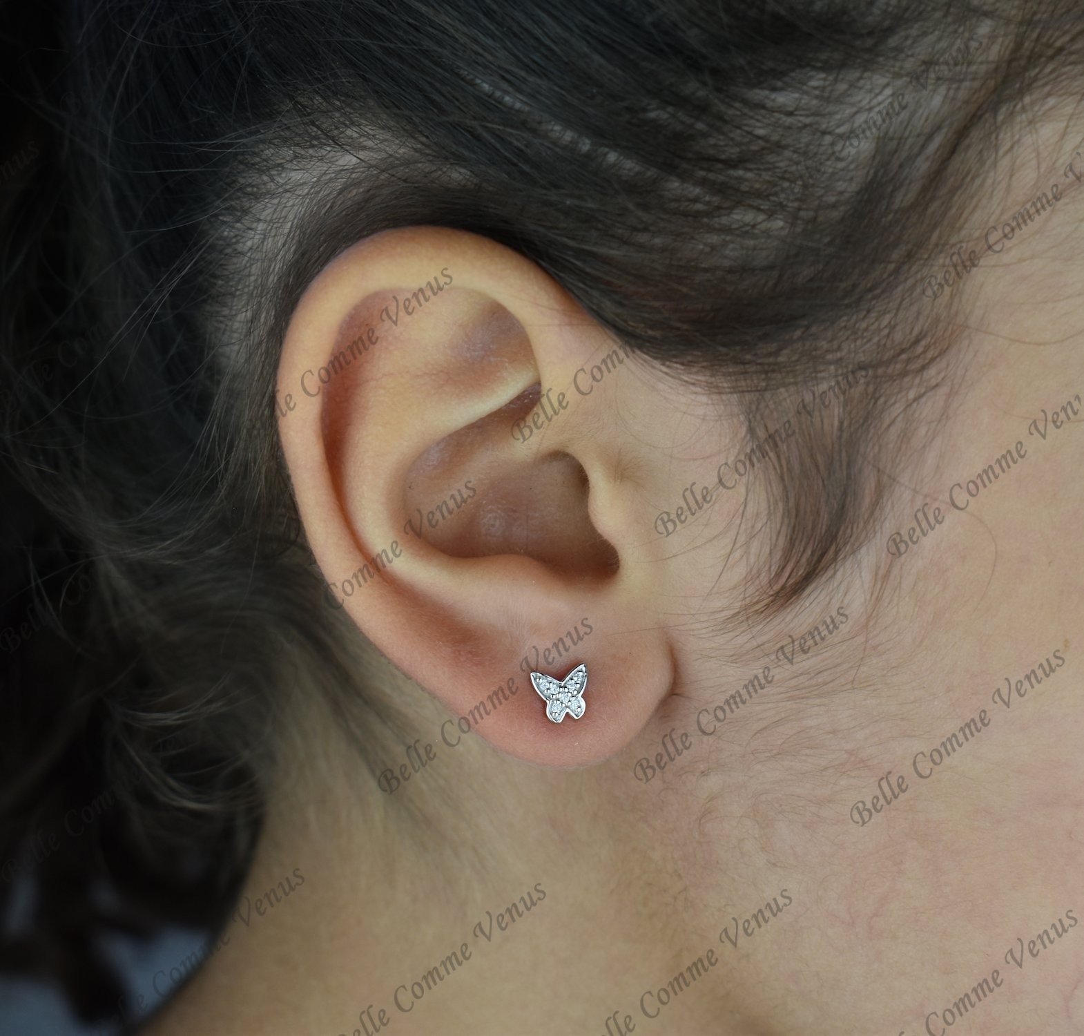 Constituées d'un petit motif visible sur le devant, puis d'une tige traversant l'oreille, elles sont fixées de façon invisible derrière l'oreille par un fermoir en forme de papillon.