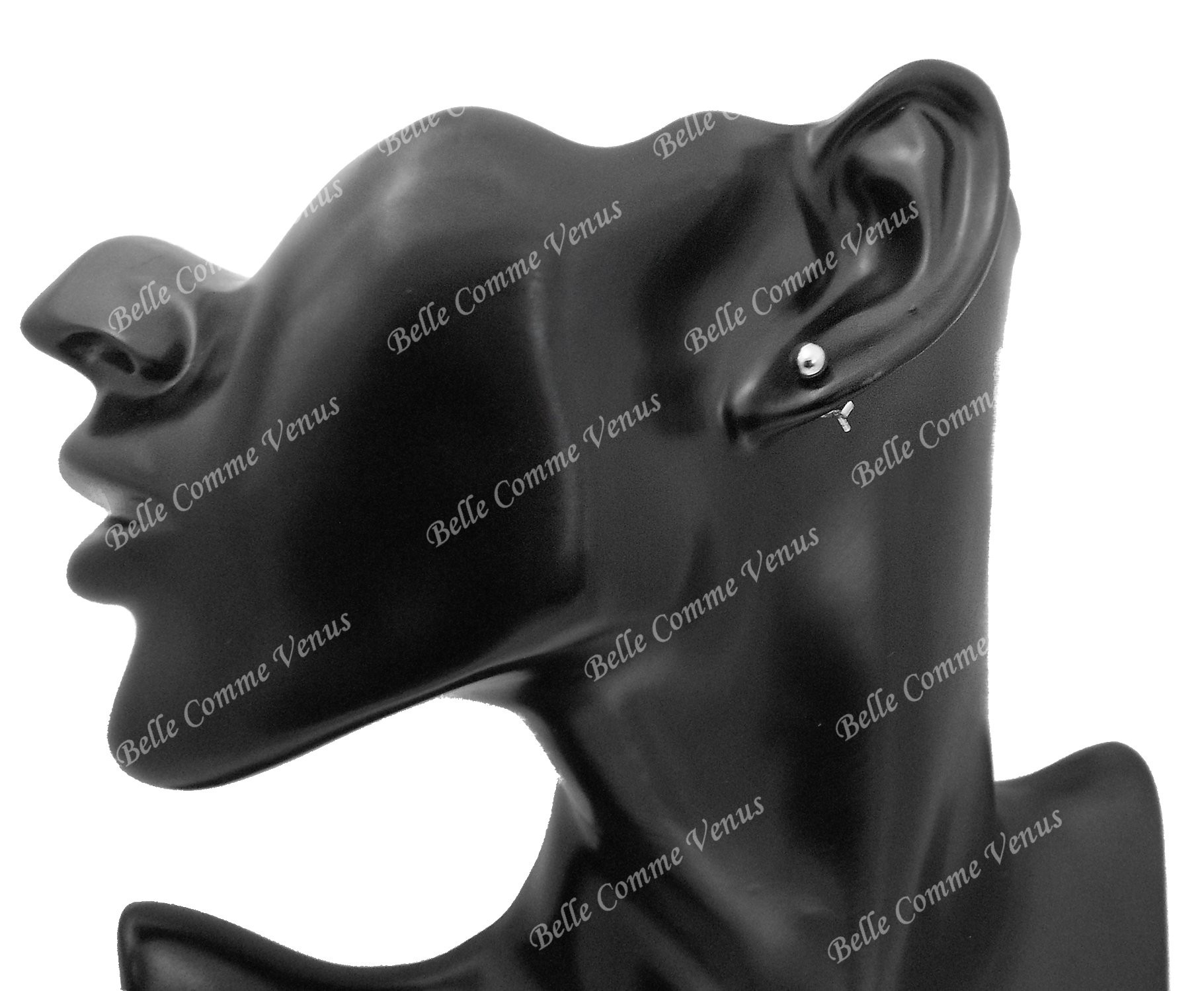 Constituées d'un petit motif visible sur le devant, puis d'une tige traversant l'oreille, elles sont fixées de façon invisible derrière l'oreille par un fermoir en forme de papillon.