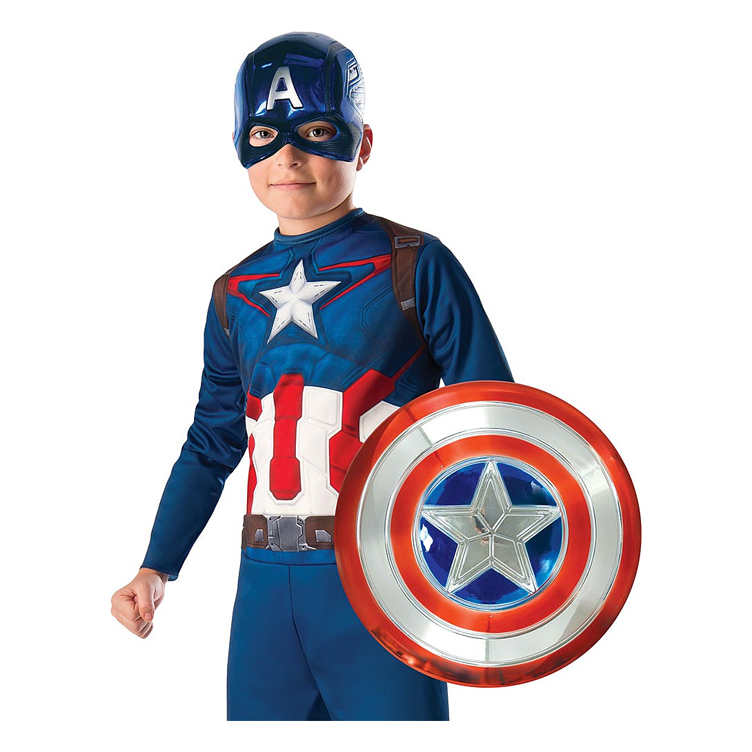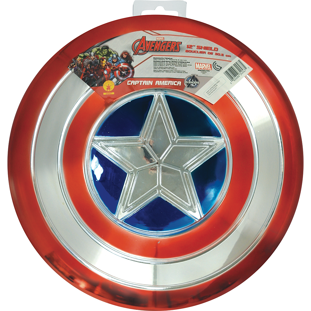 Un bouclier en plastique rouge, bleu et argenté métallisé Captain America. 30,5 centimètres de diamètre. Lanières élastiques à l’arrière pour fixation sur l’avant-bras et le poignet.