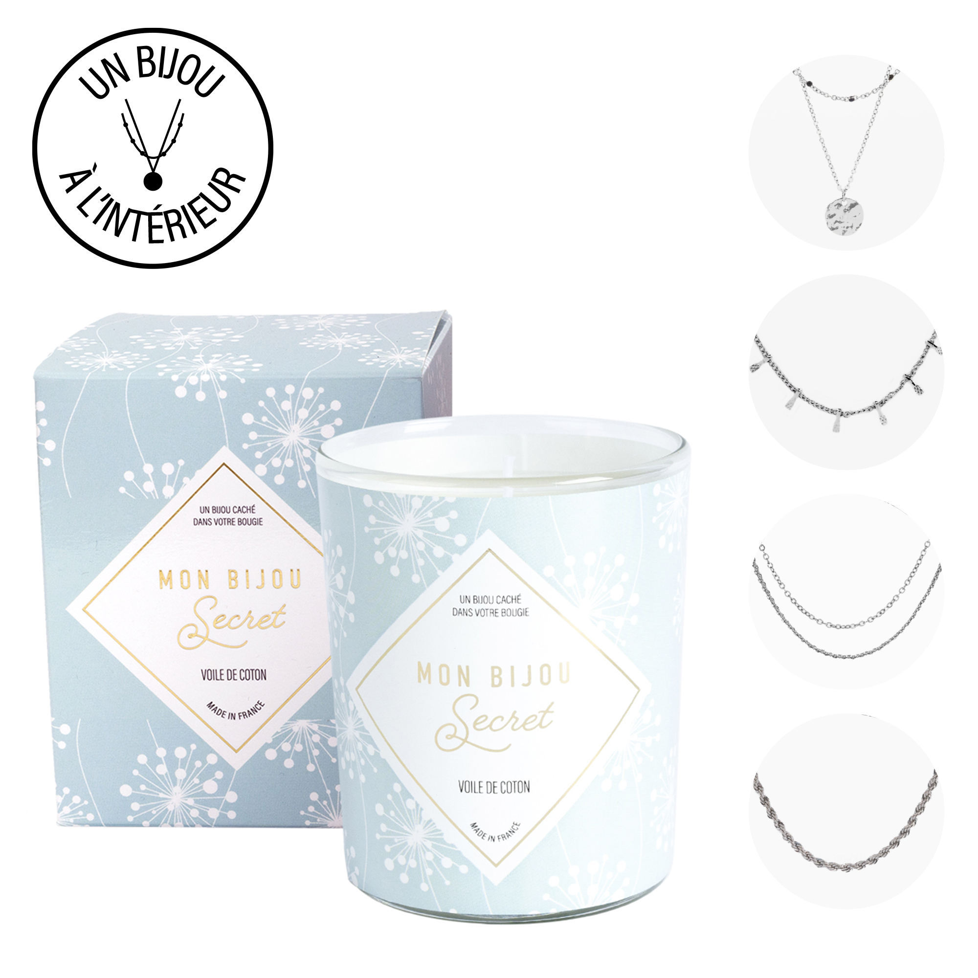 | Libellé | Bougie Bijou Fleur de coton collier argenté |