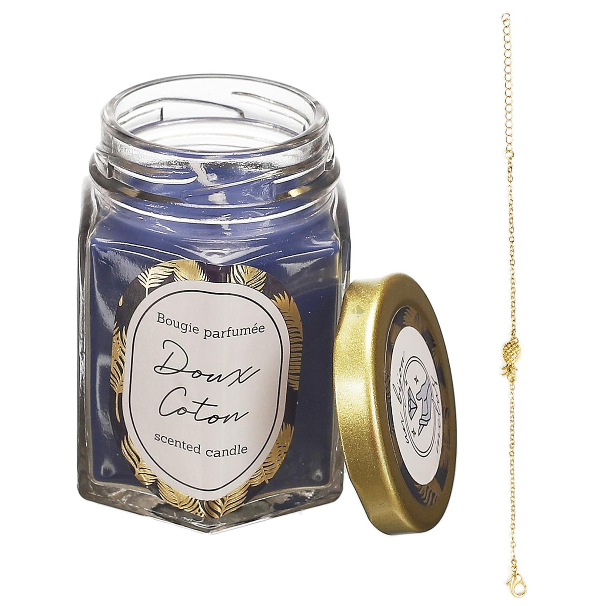 Offrez doublement avec cette jolie bougie à la cire parfumée, un cadeau qui ravira tous les sens. Présentée dans un élégant bocal en verre, cette bougie cache un adorable bracelet surprise doré à l'intérieur. À la fois décorative et pratique, elle apporte une touche de raffinement à tout intérieur.