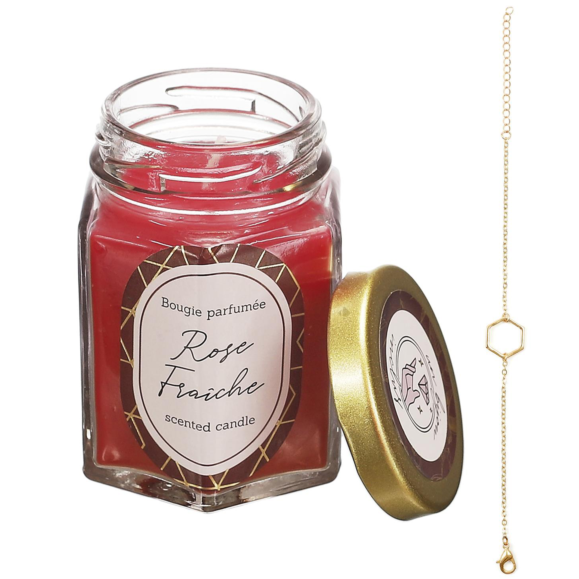 Offrez doublement avec cette jolie bougie à la cire parfumée, un cadeau qui ravira tous les sens. Présentée dans un élégant bocal en verre, cette bougie cache un adorable bracelet surprise doré à l'intérieur. À la fois décorative et pratique, elle apporte une touche de raffinement à tout intérieur.