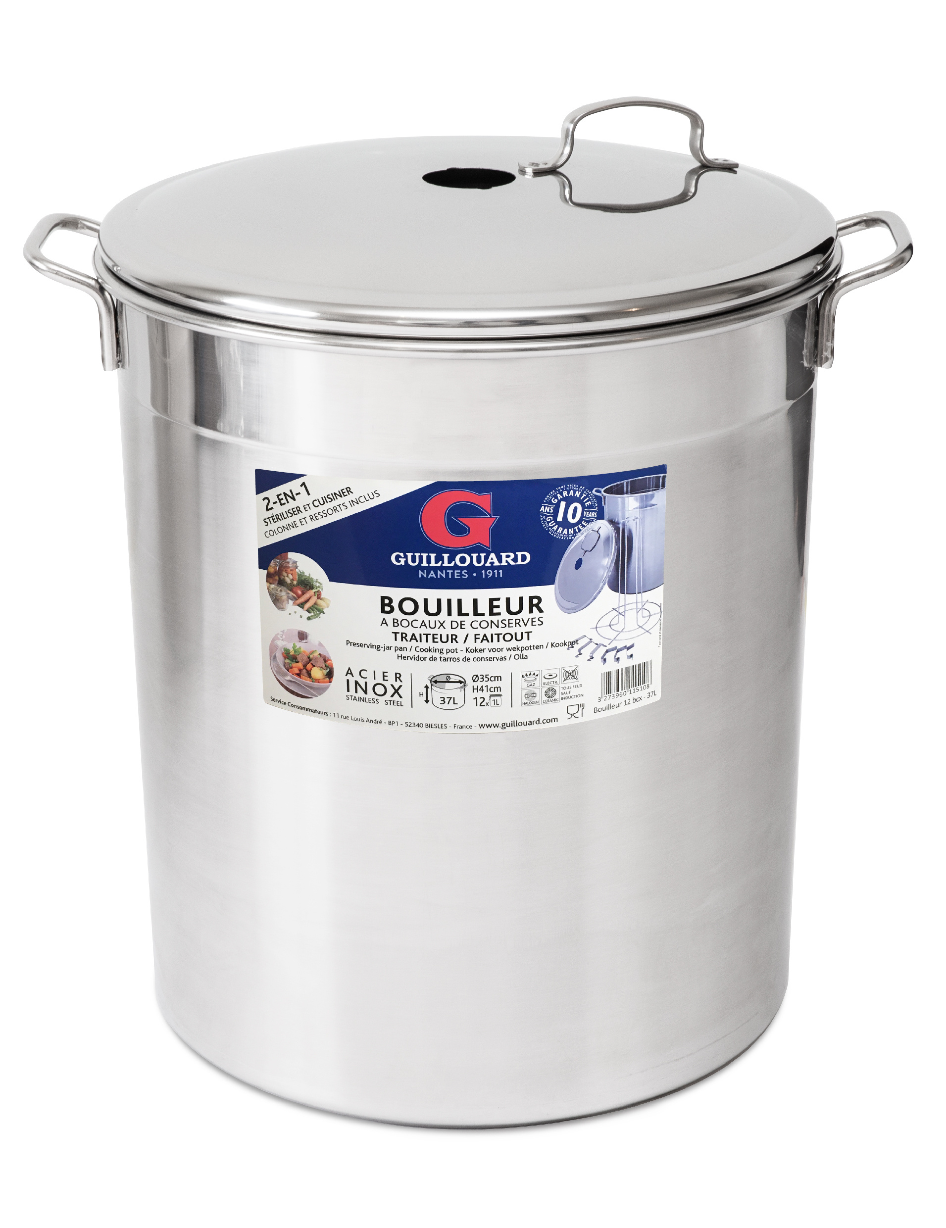 Fonctions 2-en-1 : bouilleur à bocaux et traiteur en acier inoxydable Cuve munie de 2 poignées et couvercle avec une poignée et trou central pour le passage du thermomètre (vendu séparément) Fourni avec une colonne intérieur et 6 ressorts de maintien pour fixer les bocaux et éviter qu'ils ne bougent durant la stérilisation. Surface garantie contact alimentaire pour cuisiner en grande quantité, réchauffer et servir de boisson. Très pratique pour la cuisson des fruits de mer (moules, crabe…)