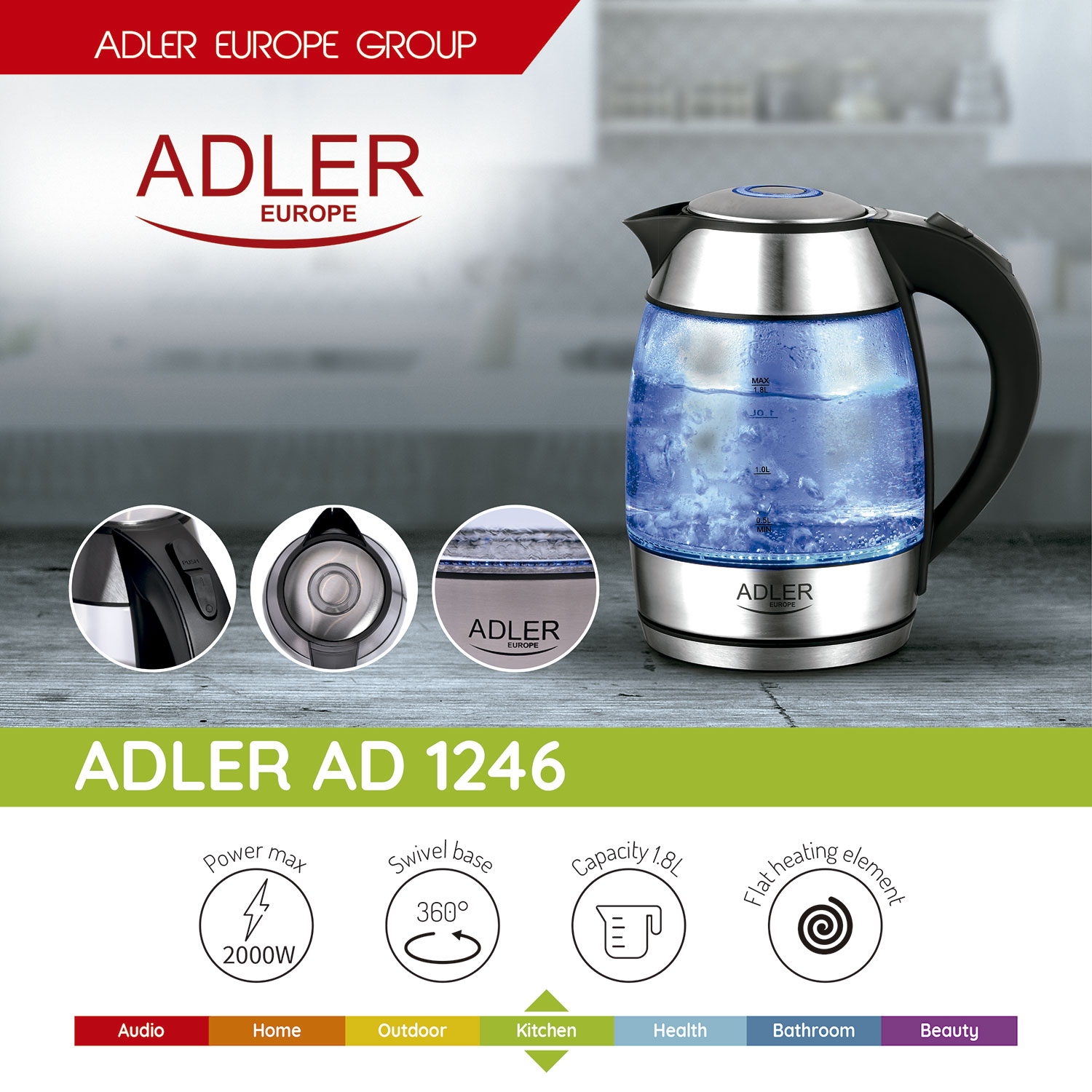 | Libellé | Bouilloire électrique, verre de 1,8 litre, récipient sans BPA, sans Fil 2200 Transparent AdlerAD1246 |