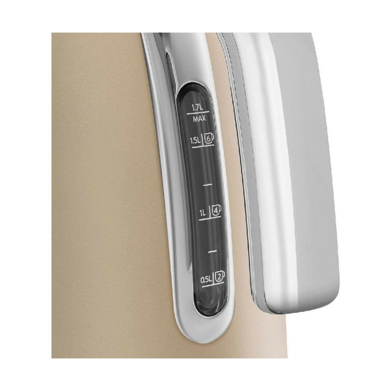 La bouilloire possède un couvercle avec ouverture progressive qui empêche l’évacuation soudaine de la vapeur chaude. Elle peut contenir 1,7 litres d’eau soit l’équivalent de 7 tasses, qui est indiqué par la double visualisation litres/tasses au niveau de la poignée.